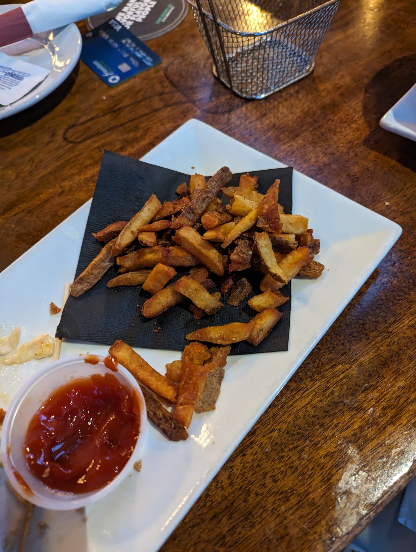 We ordered food too, which took a bit longer. We ordered nachos, wings x2, and a hamburger. The wings were the best option, except for the hidden valley ranch that was served with them. The nachos were ok. The $21 hamburger was a joke. Worst hamburger ive had in a long time. The whole table agreed. I wouldnt even pay $10 for it. It had two thin overcooked patties, a leaf of lettuce, few raw onion stings, a pickle spear, and thats it, for $21. We were literally laughing at how bad it was. It was so dry, and the bun was huge. The burger came with like a dozen bland fries and ketchup. We couldnt even mention it to the server bc she was too busy to bother asking. We asked for silverware and napkins as well. After about 15mins, we finally got napkins, but no silverware. We had to cut the hamburger with the wooden skewer that was served with the burger. She saw us cutting the burger with the skewer and instead of grabbing the silverware we asked for, she instead asks if we still need them. "No thanks. We have this wooden skewer. All set. Thanks"