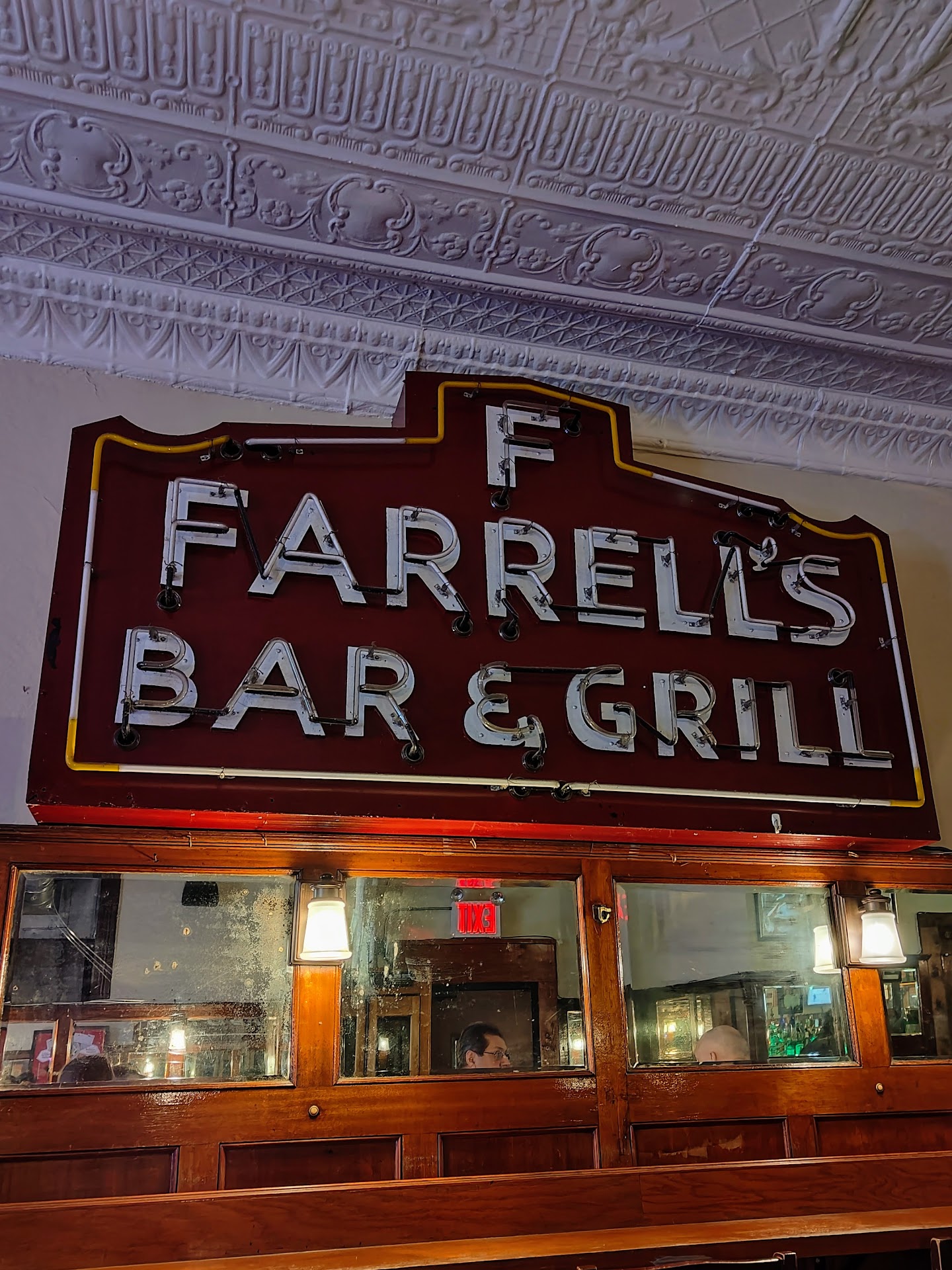 Read moreAtmosphere is plentiful but the "grill" part of the name is, what? Symbolic? Wishful thinking? A metaphor? No food here, just beer and basic drinks. This is really a shot and a beer kinda place. Back in the day, Farrell's only served Bud, but modernization has happened here too. Possibly it has happened because the old Irish, Italian and Polish working class nabe is long gone and the new patrons demand more. So now they also have Stella on tap and a few other options in bottles such as Coors, Guinness and even some IPA. (My father-in-law is rolling in his grave over that one.) Numerous basic whiskeys as well as a couple vodkas and gins are available and, oddly, you can actually get your beer "to go". They fill up a BIG styrofoam cup, slap a lid on it and out the door you go. Open container? No problem here. (What do they think this is? New Orleans with go-cups?) Anyway, good place to stop by for a cold one on your way out or back to wherever. Always sports on the TVs and some folks to talk to. Pete Hamill did it for years, and...