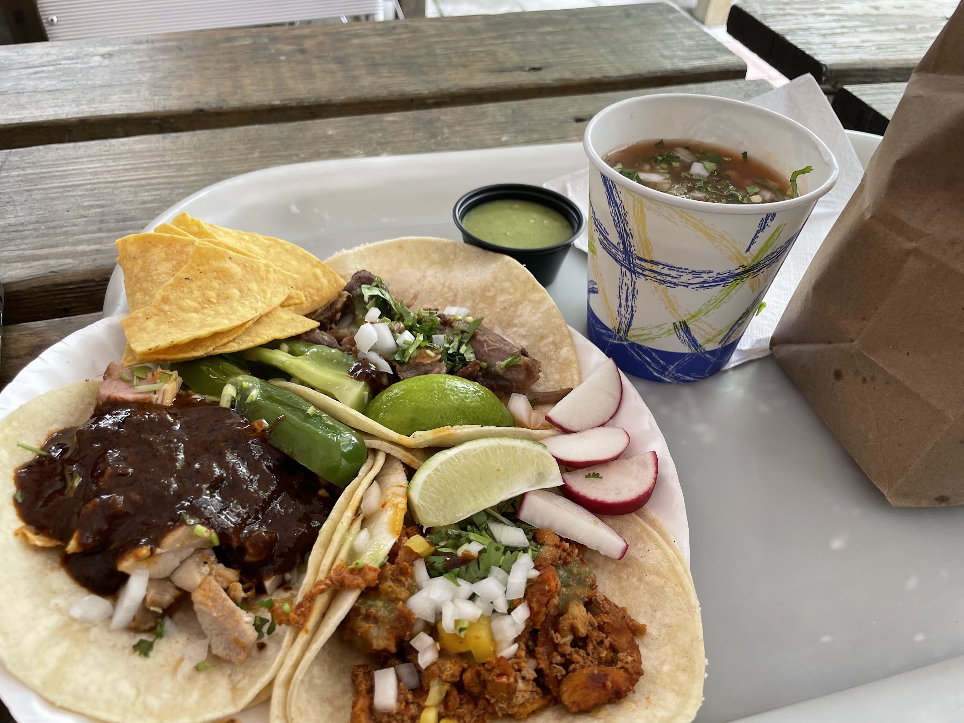 The chef must have changed. I judge a Mexican place by its chips. I was super excited to see homemade chips in all the pictures - they correlated well with the high rating for this place so I made the mistake of not reading recent reviews. Instead of homemade chips, I received very boring store-bought chips. The chicken mole taco and the pork/pineapple tacos tasted very good (I got both carnitas and el pastor accidentally as the cashier rang me up for both when she misunderstood my question about which she recommended - so I got three so she wouldn’t have to change the order or absorb an extra credit card network fee) but I thought everything was chopped too coarsely (meat/radish). I found the menu confusing and thought that tacos would come with an avocado slice - note only veggie tacos come with the avocado. I probably won’t come back, but if I do I’d order only two regular tacos and skip anything with chips. The backyard was a pleasant surprise - I’d never tried it before because the front looks dumpy. The place is “so close but yet so far”. For the $21 I spent I’ll stick with the other Mexican place across the street. Spend time reading the recent reviews, then just get what people specifically recommend. Also note the menu shows two sizes of guacamole but they only offer the large size. Things have changed here so do your homework and you’ll have a fine but not...