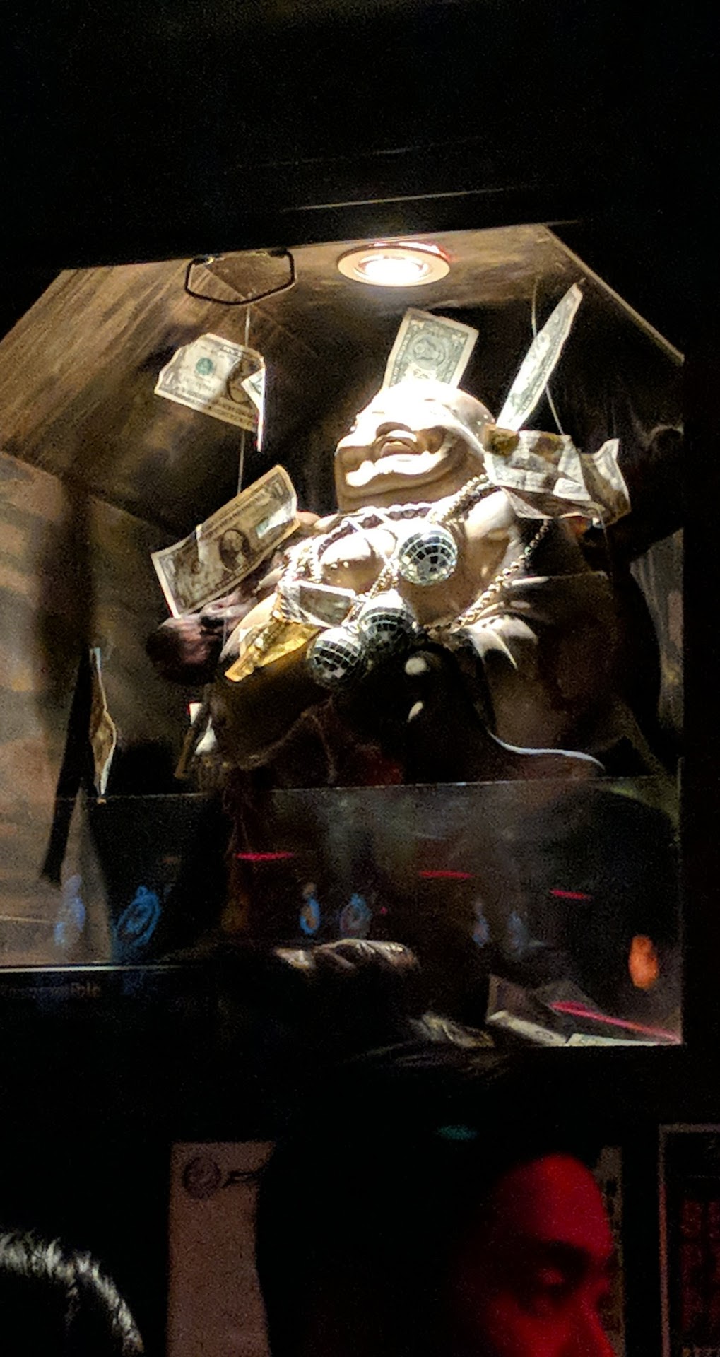 Celebrating a friend's going party I was asked to quickly find a spot that we could all go to and have no problem getting the group in. I looked at the specs and decided to give a shot to Fat Buddha. I'll tell you right off that bat, that I took one star away because there was a cover charge when so many of the other nearby venues didn't have one. By the time I realized this it was too late as half my group had already gone in before I could guide the other half over. I pulled the second star because the door staff was slightly abrasive in personality. We brought an even (1:1 ratio of males to females) mixed crown of ~20+ people but they seemed as though we were a nuisance for coming over.