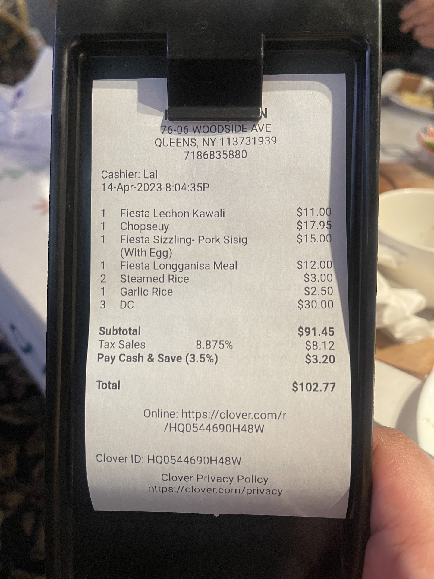 Came here to get some Filipino food with two friends but instead of the usual Roosevelt Ave line of restaurants I said letās try FiesTam Bayan, came over greeted was sat down right away. Ordered some food, the food was usual Filipino flair to me , nothing more exciting than any of the other restaurants around. Our water glasses also were filled very promptly. So I thought okay nothing terrible but nothing exciting either . It wasnāt until the bill came there was a random DC charge of $30 , which was basically a charge of $10 each person in my group because they had a ālive bandā performing, which honestly in my opinion seemed like more like a 2 guy friends singing and drinking alcohol with friends just for fun not for a actually performance. This was definitely a turn off nothing against the band but the restaurant should mention it upon walk in , or at the door or even in their menu , what if I had a large group that would easily add up. Basically in the end not worth looking parking for as it is very difficult in that area itās located in . Stick to some other...