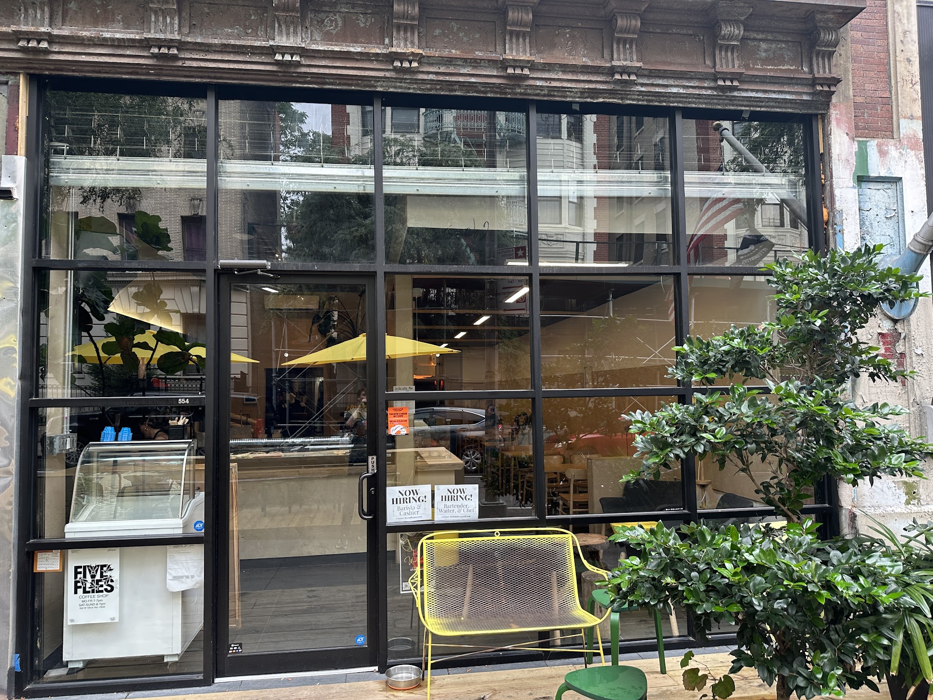 Ā Ā Ā Read moreAfter finally taking heed of my partner's discover of Five Flies and her raving reviews I finally took the long walk and went there and it far surpassed my already high expectations. The staff is incredibly friendly and sweet, the pastry/dessert selection is truly divine (vegan pumpkin pie?!?!? YES PLEASE), and the coffee was super delish. What was the best part beyond those already amazing things? THE BACK ROOM! Computer free (love it), eclectic and spacious, this room was truly a dream and how I want my future house to look should I ever be able to afford one. :p Antiques mixed with colorful comfy seating (big plus on comfort), random typewriters, all sorts of goodness. As an artist, this place was so dreamy and inspiring to me that I did a little funky distorted art version of the room. Great place to read, relax, do art, scrolll your phone, have awesome convos, all while partaking in delish goodness. I have not been to any of their events but would love to and would love to see more live music and fun stuff in that back room and love that they are open until 7 pm which seems to be relatively rare for coffee shops in NYC which is strange for the "city that never sleeps". I have made the long walk often since and plan to many more...