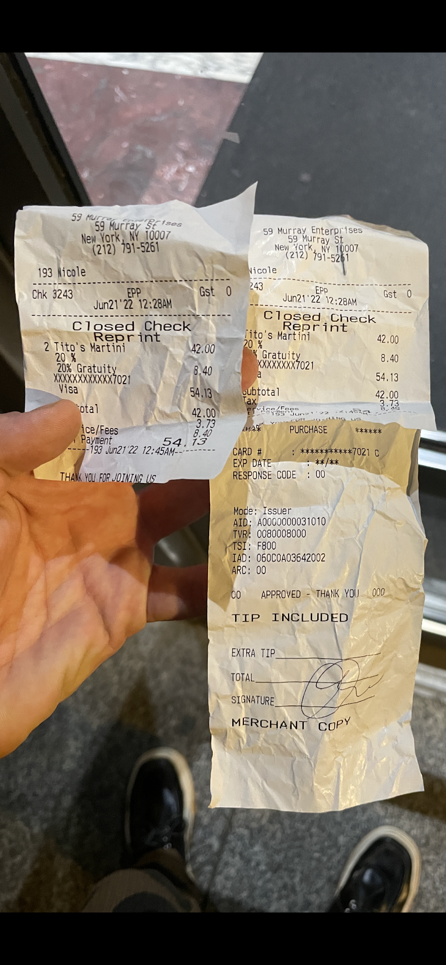 Ten minutes later I had a hunch of what had just happened- I recalled a story of a friend being taken advantage of, a story where they were charged hundreds of dollars without consent at a strip club. So I requested for a ācopy of my last receiptā - āNicoleā starts acting deeply uncomfortable - trembling - she told me she threw my receipt it in the trash. I challenge her and I request that I want a copy of my receipt. Sheās clearly struggling - it is visible that she is deliberating confessing what had just happened.