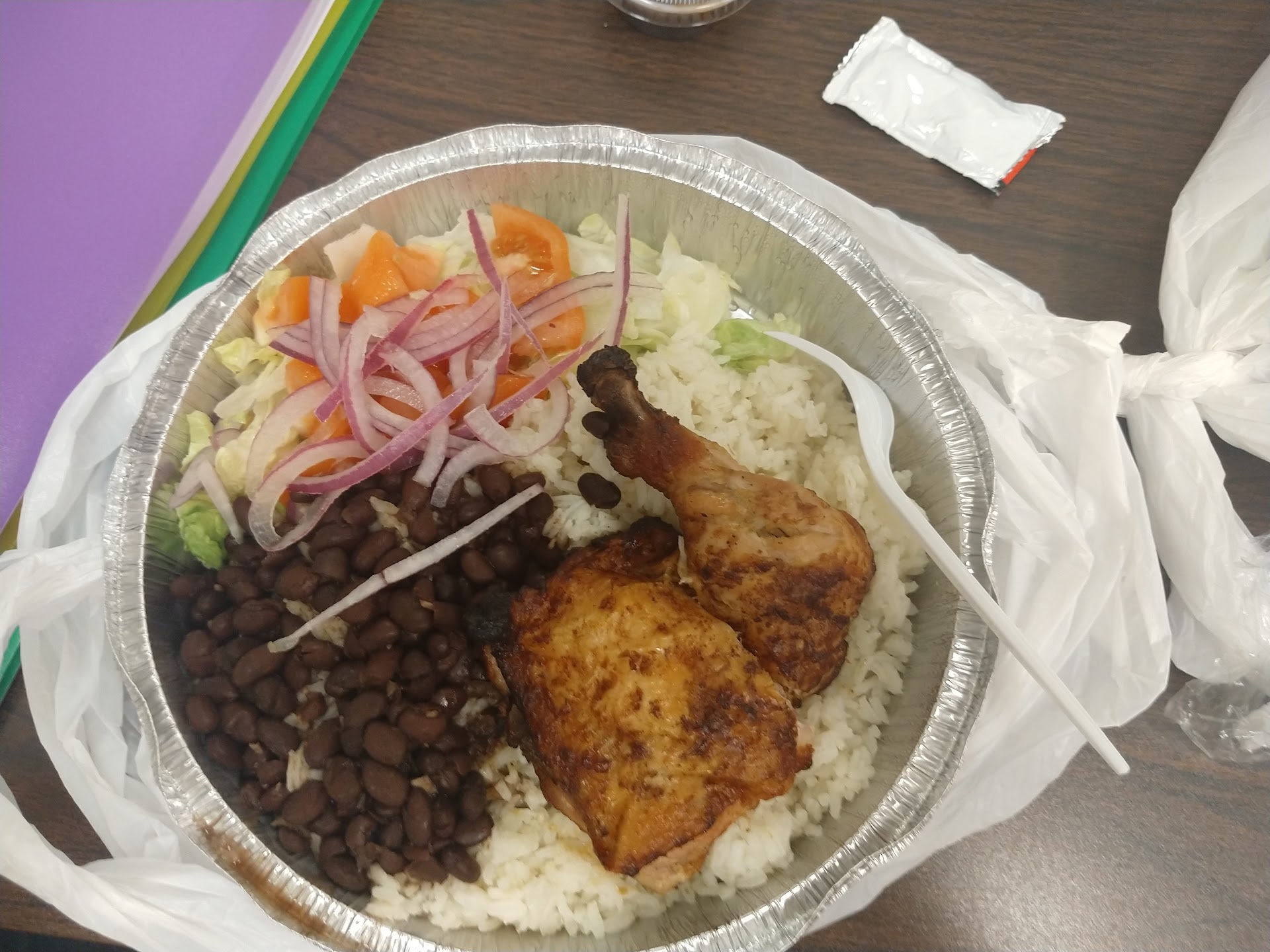 My favorite food is the whole barbecue chicken, yellow rice and black beans and two orders of tostones (fried plantains).