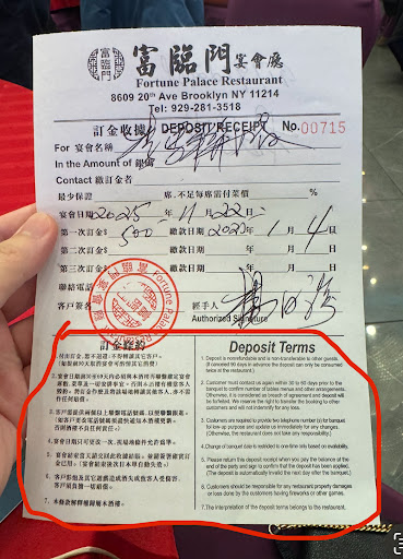 We previously paid a $500 deposit to hold our wedding date in November but realized the expected number of tables we have exceed the capacity at Fortune Palace. We decided to use the $500 as credit for our dinner tonight which is stated as possible on the receipt & the manager that assisted us previously.
