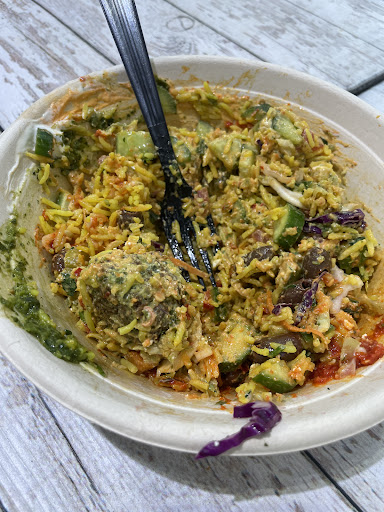 I had the Gyro salad, on a bed of greens, grilled chicken, cucumbers, humus, avocados, cole slaw, tahini sauce and dressing. The guys at the counter were super sweet and patient. They were quit understanding as this was my first time and they made recommendations for what best complimented the items I chose in terms of flavors. Overall cost about $16.