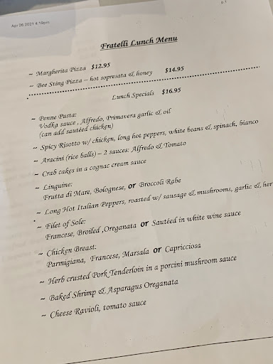 ย ย ย Read moreMy husband and I have eaten at Fratelli dozens of times and we plan on eating there dozens more. The servers, bartender/manager and head chef/owner have always been courteous, attentive and accommodating. The establishment is clean and has a warm, friendly atmosphere. The portions are generous (we've never left hungry). 'Dinner menu' prices are about the same as comparable sit-down Italian restaurants in the Baychester - Williamsbridge - Morris Park area. We've called in orders to go numerous times as well (take-out style) and have never been disappointed. Our orders were always complete and ready for pick-up at the promised time, even on New Year's Eve when they were packed to the hilt. Our only complaint is the small size of their parking lot, but there is ample street parking within a walking distance of one to two blocks so this is a very minor complaint that doesn't detract from my...