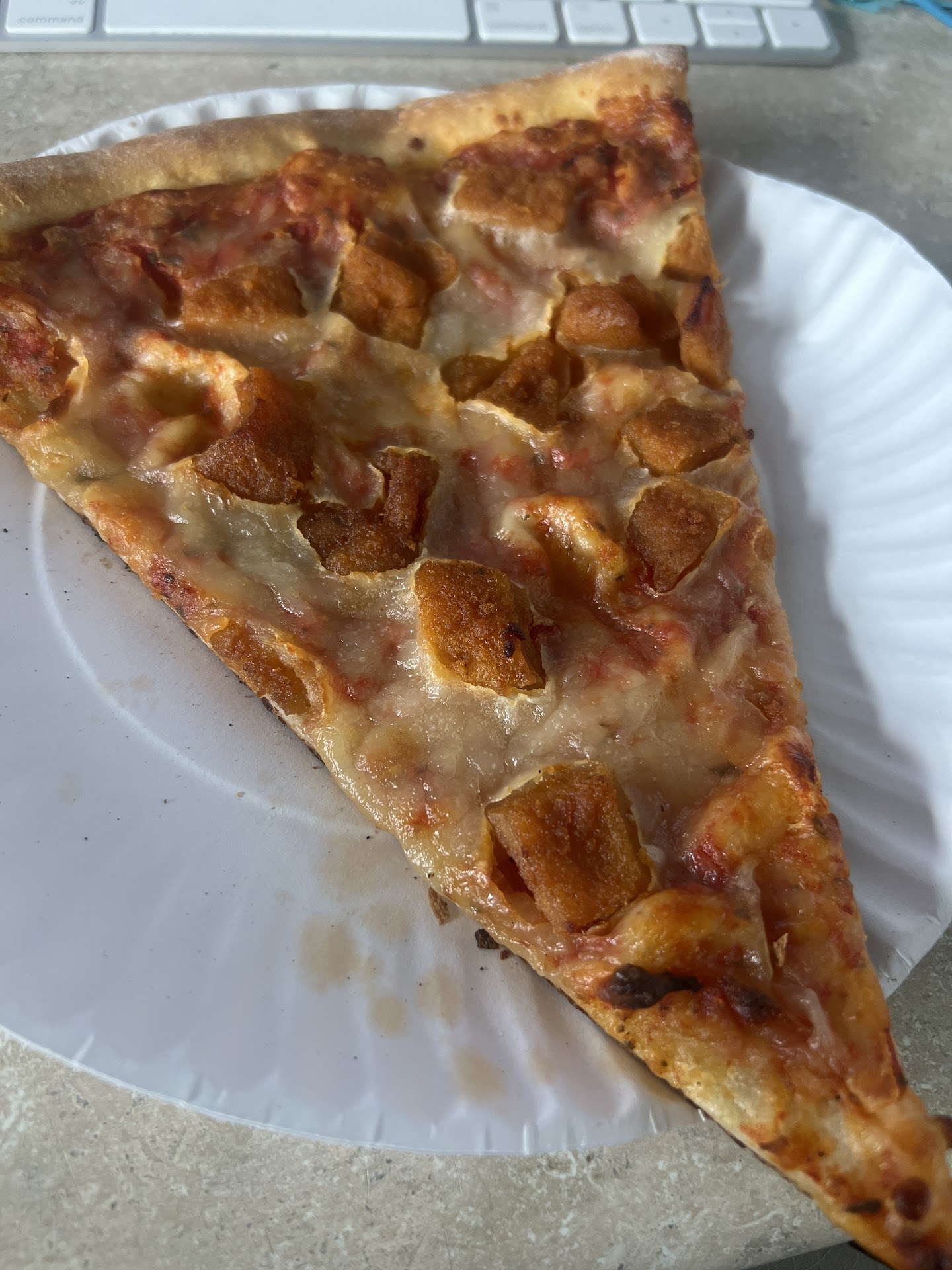 I ordered two plain slices, a buffalo chicken slice, and a mushroom and pepperoni slice. Unfortunately, the mushroom and pepperoni slice was so oily and tasteless that it was inedible—I ended up throwing it out even though I was really hungry. The plain slices I gave to my kids weren’t much better; they filled them up, but the flavor just wasn’t there.