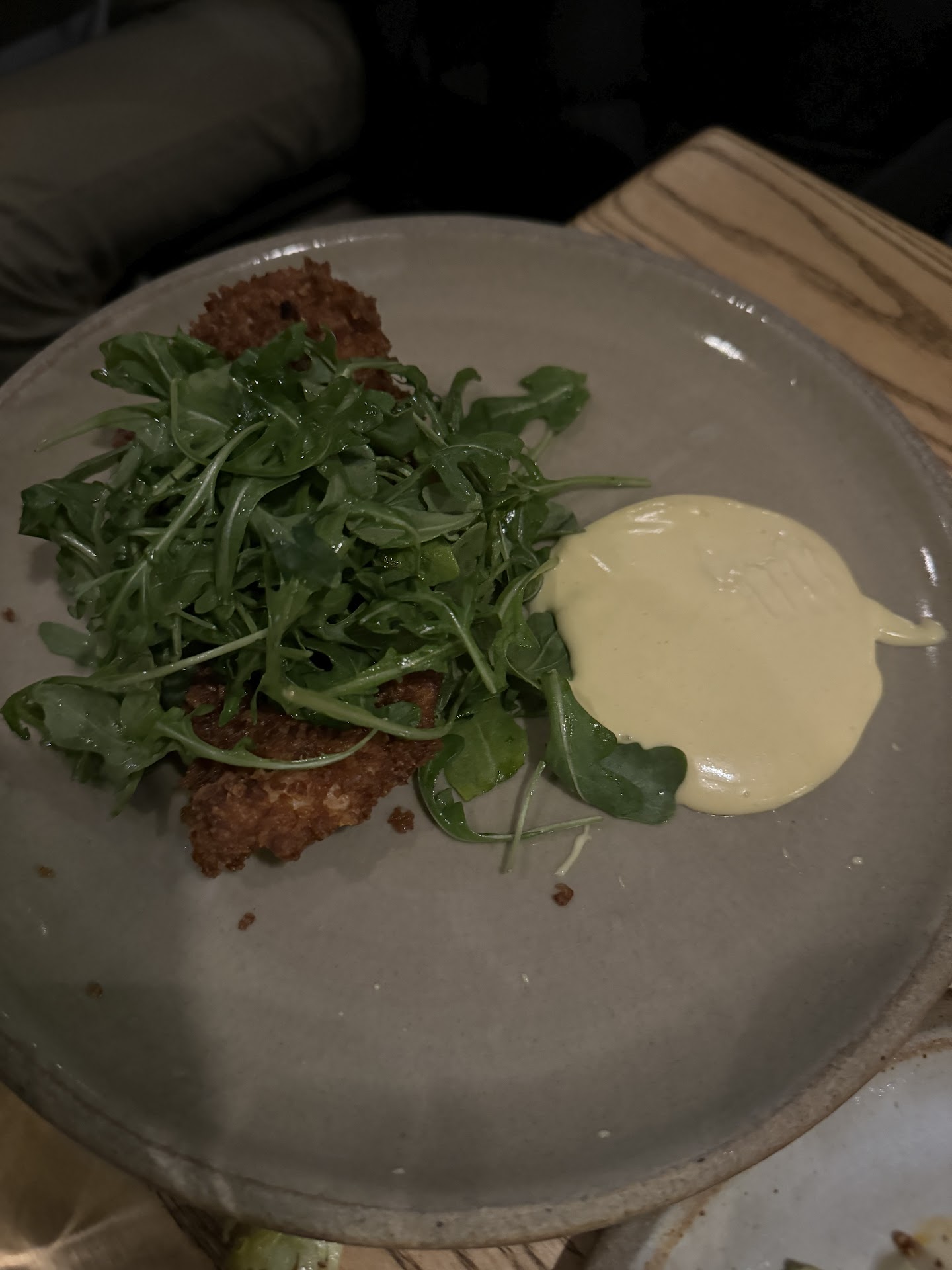 Read moreThis place is interesting, maybe worth the try if you live in the area. 2.5 is probs more fair We got spiced potatoes, brussels sprouts, and the crispy chicken. Spiced potatoes - came in a bowl with the sauce at the bottom. It got really warm and watery, but the potatoes were still flavored nicely Brussel sprouts - genuinely the first time I’ve ever felt confused about a dish. The parsnip purée looked like glue at the bottom and made the entire dish kinda…gloopy? like glue? The quinoa lacked…flavor? it just tastes like fry oil and aleppo pepper. The way the entire dish tastes just feels…not cohesive in any way. The crispy chicken - was literally just fine. Came with some sort of sauce/mayo but seems like no flavor or spices.