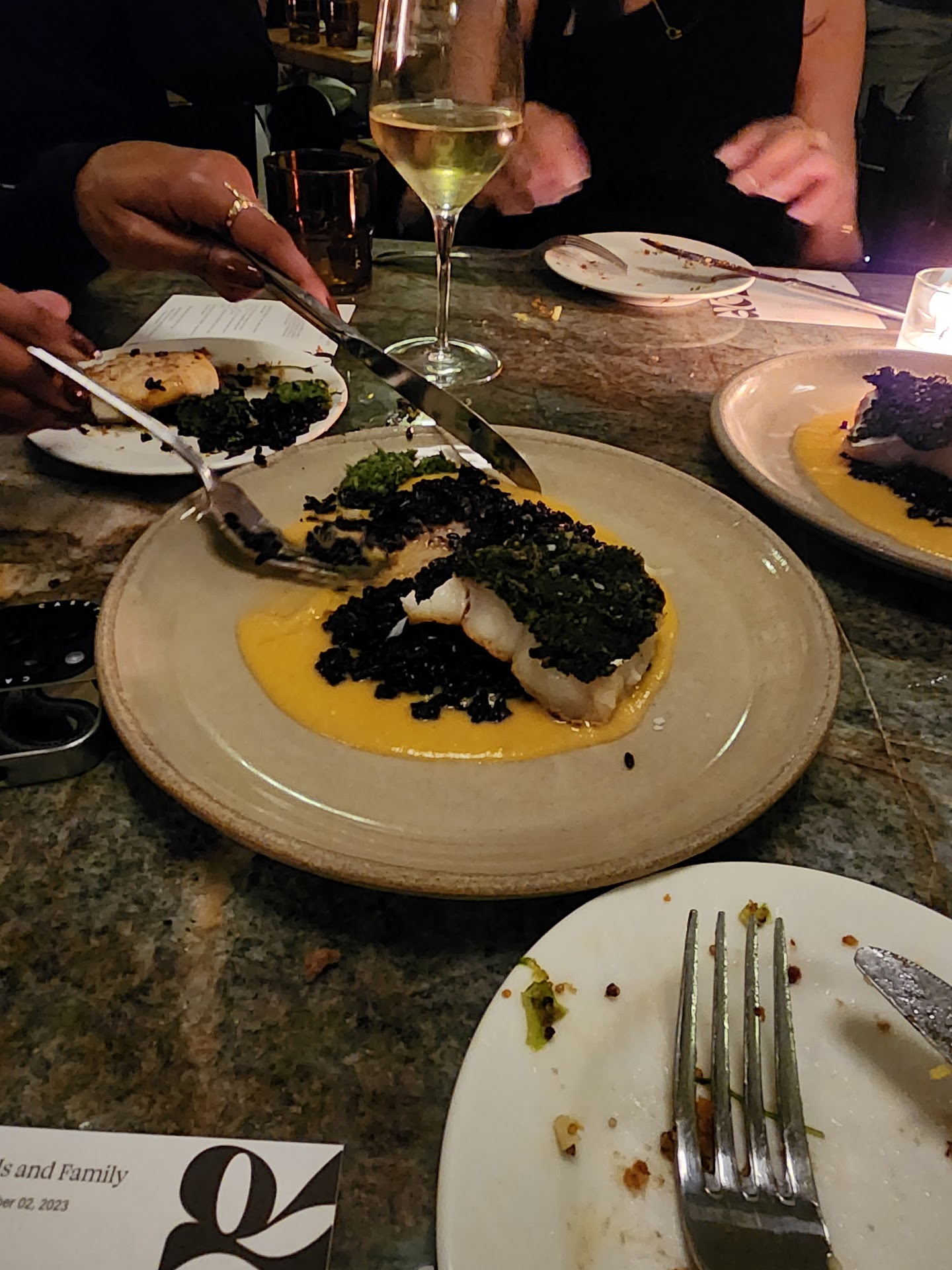 Foccacia: It's 2 pieces of bread. The compote was very sweet. This was $10. Shaved Brussels: Another reviewer commented on the gloopy sauce. It was quite gloopy. The fried quinoa gave a nice texture. This was $16. Crispy Chicken Paillard: It's a deep fried chicken cutlet. The breading was crispy. The meat inside was tough and without much flavor. The aioli was necessary. This was $28. Sticky Short Ribs: There was about 4oz of meat here, surrounded by their coconut grits. The ribs were quite flavorful and had a fall-off-bone consistency. The grits tasted like sweet coconut and may be nice if you like this kind of thing. This was $38. Duck Breast: Two pieces of extremely tough duck breast with a puree of something around it. It was quite difficult to cut with my dull dinner knife. I looked like a lumberjack trying to saw through this thing. I think this was $50. Flourless chocolate cake: Tasty chocolate cake.