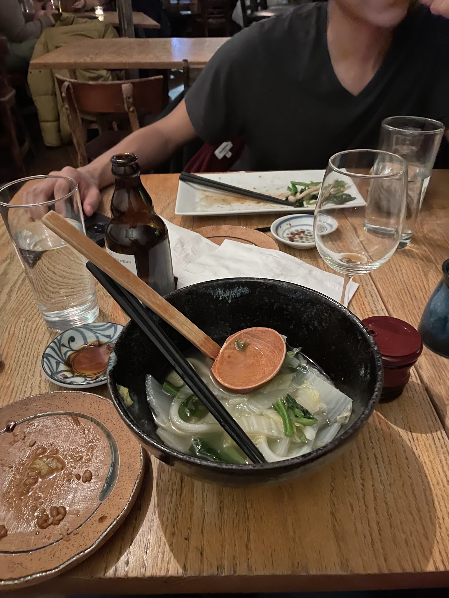 I got the ramen, and I was underwhelmed. There were a decent amount of toppings, which is were a lot of ramen spots fall short, but the chashu pork belly was ice cold. I understand that is something prepped in advance then reheated by the individual serving, so there wasn't any danger of food poisoning or anything like that, but it detracted heavily from the dish. I would have asked our server to heat it up, but they were nowhere to be found as mentioned previously. The broth was also noticeably bad, lacking any sort of richness or depth, and tasting strongly of bouillon powder, which I can only imagine they used instead of the more expensive dashi stock. Again, I wouldn't be writing this if the prices were a bit more reasonable, but don't charge luxury prices and offer mediocre food.