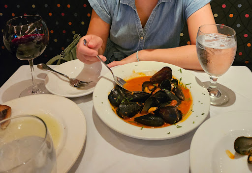 They had pre-fix dinner that usually offers only Tues - Thurs until 8pm. Since it was Tuesday, we decided to focus on the prefix dinner. The price was extremely reasonable (around $25 per person). It includes an appetizer, main course, coffee, and cheesecake. Which is unheard-of in NY. Without much expectation, I ordered the cheese and tomato while my wife ordered Mussels with red sauce as appetizers.