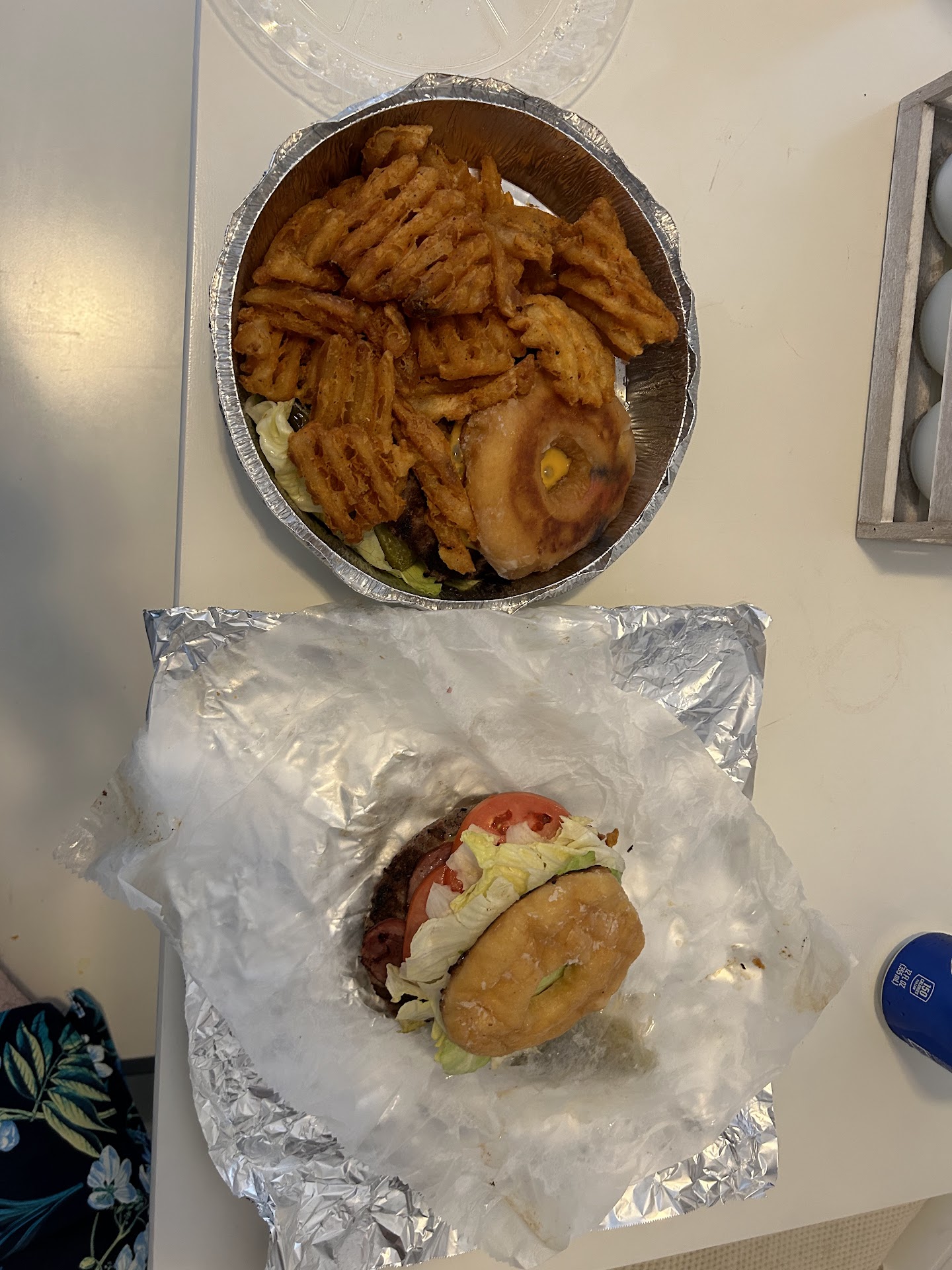 Love, Love, LOVE this breakfast spot. I order from here regularly. The food is always fast, fresh and budget friendly. The guy who takes phone orders affectionately refers to us as “The Donut Family” because we usually order the last donuts of the day. What’s pictured here is seasoned waffle fries and a special made burger (bacon cheddar cheeseburger on a glazed donut w/lettuce & tomato). They are open very early. They take cards and cash. The staff is super friendly. Great for delivery but not so great as a dine in spot (they do have a couple of chairs inside but it’s really too small to sit and enjoy a meal without having to move for the incoming...