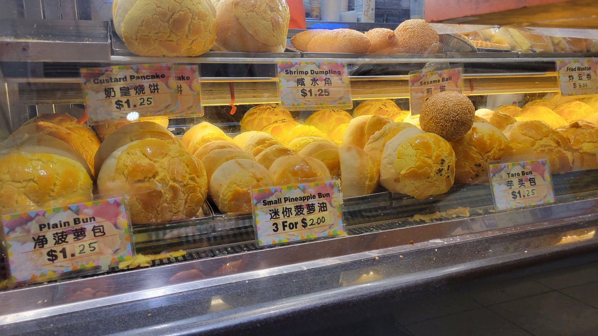 This place is great for certain items and just ok for others. This is my go to place for custard buns, raisin twists, sesame ball and red bean filled mochi (4 for $2.50). If they still have it, get the shumai and the hargow (shrimp dumplings). They usually run out by 2pm on a weekday, a lot earlier on a weekend. The shumai and hargow are 4 pieces to an order for $3.25. A bit higher than dimsum joints but in this day and age of a pandemic, everything is more expensive and I'm happy to get to eat some dimsum in the first place. The workers are nice though they do tend to take orders from Chinese speaking people first. I get it. You just have to be assertive (but not rude!) when ordering here. Overall, this is one of my staple joints in Brooklyn Chinatown when I want a quick snack or...