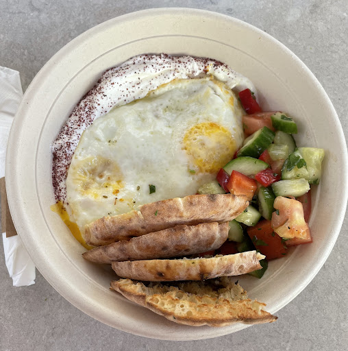 Came here for lunch on a Friday during my lunch break. Outside seating is cute, spacious, and well heated. Got to sit next to a well behaved dog which was a plus. I ordered Greta’s Breakfast inside and the food came out rather quickly. Absolutely fresh and delicious. Healthy without leaving you hungry or … cold like after you eat a salad when you really want something hot. I love fried eggs more than anything so two of those was a plus. Normally I view potatoes as a waste of time and space (sorry!) but these were melt in your mouth and spiced deliciously. With the labneh and egg yolk, it was one of my favorite bites of the year so far. And for a crisp contrast - a refreshing portion of Israeli salad with red bell pepper in addition to the usual tomato and cucumber which I thought was a nice twist. And last but not least, what I turned into edible utensils, the toasted pita with zatar. Mmm! Such a lovely combination of flavors and a rainbow of bites for lunch or breakfast. So satisfied and definitely coming back to eat my way through the rest of the menu. Staff is super friendly...