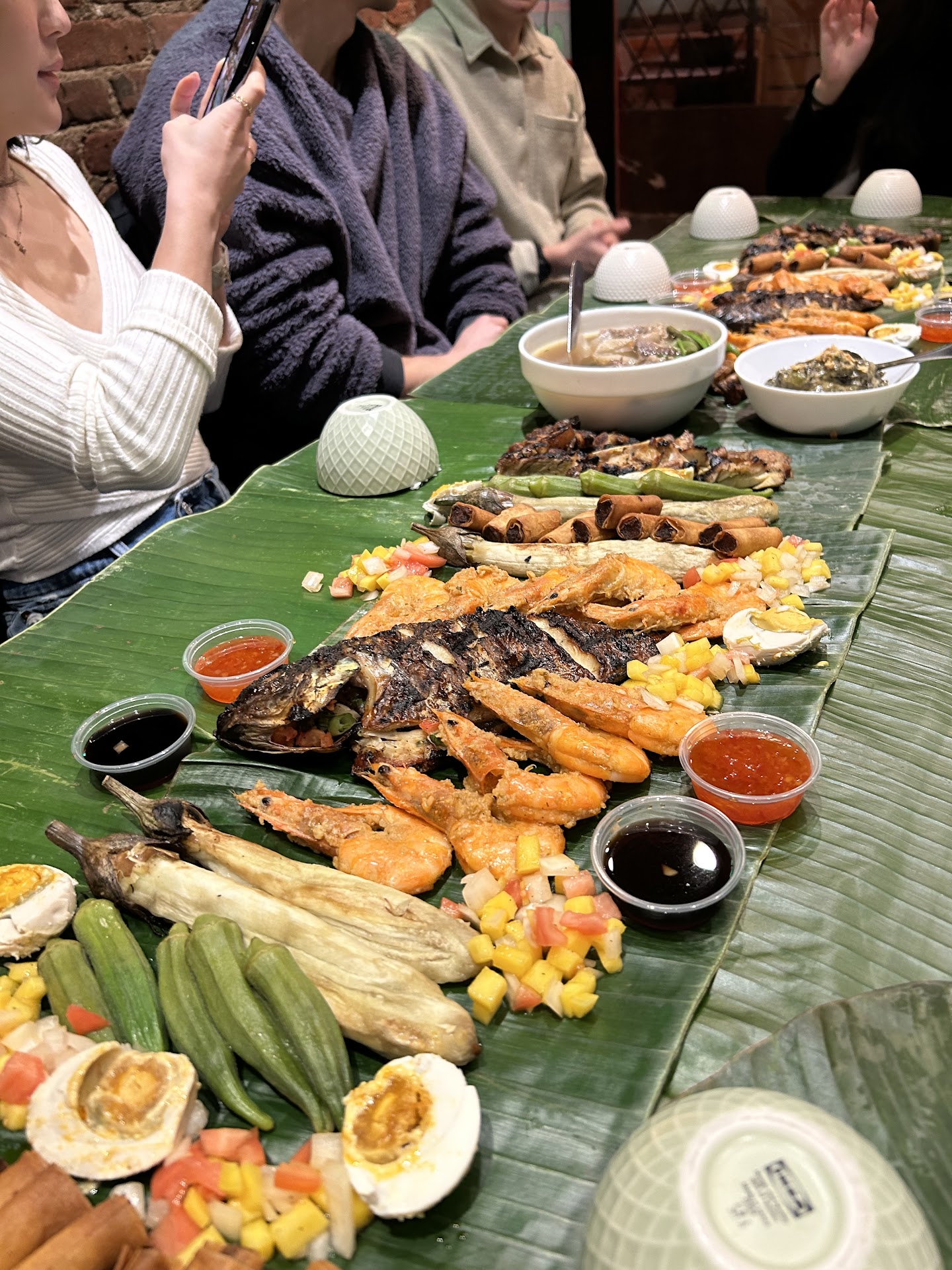 The food is great. We ordered the party type food of pancit, adobo, sisig, pancit molo soup, etc. Portions are made for sharing family style. Much of the food is fried and greasy but oh so delicious. The soup comes in a giant bowl. It can serve quite a few. The restaurant allows dessert to be brought in from the outside. There is outside seating available when the weather is good.