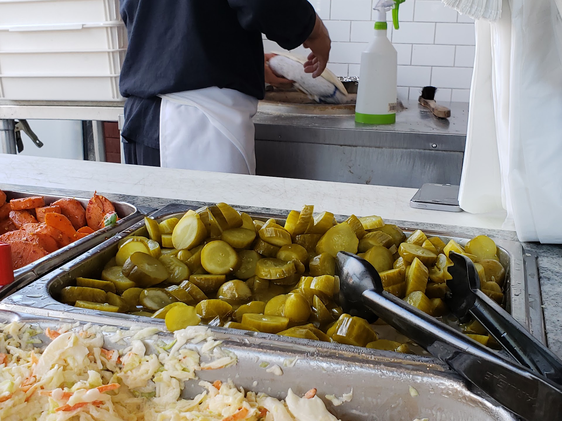 The entree plates are also expensive but huge. Most people seem to share or take leftovers home. It's a busy spot with waiter service I. The back, counter service and takeout in the front. And some seating for counter service too although it's not sufficiently air conditioned during the summer months between the bread oven, schwarma spits and grills not to mention the sun streaming in thru the big glass windows.