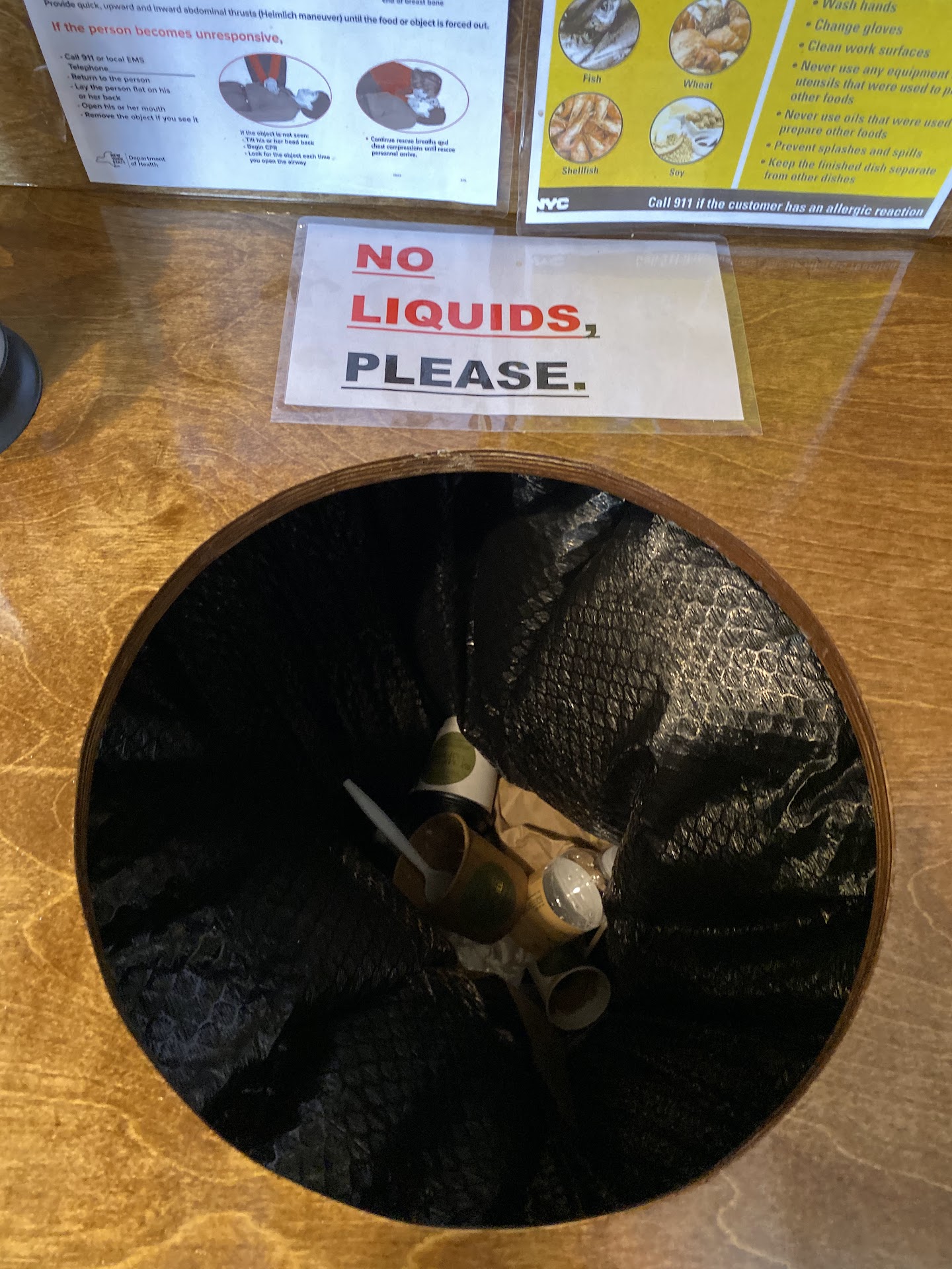 The milk and sugar station is often out of something — almond milk, simple syrup, etc. They recently added a sign that reads “no liquids please” above the only trash can. I guess you either need to completely finish your drink or throw it out elsewhere? Makes no sense.