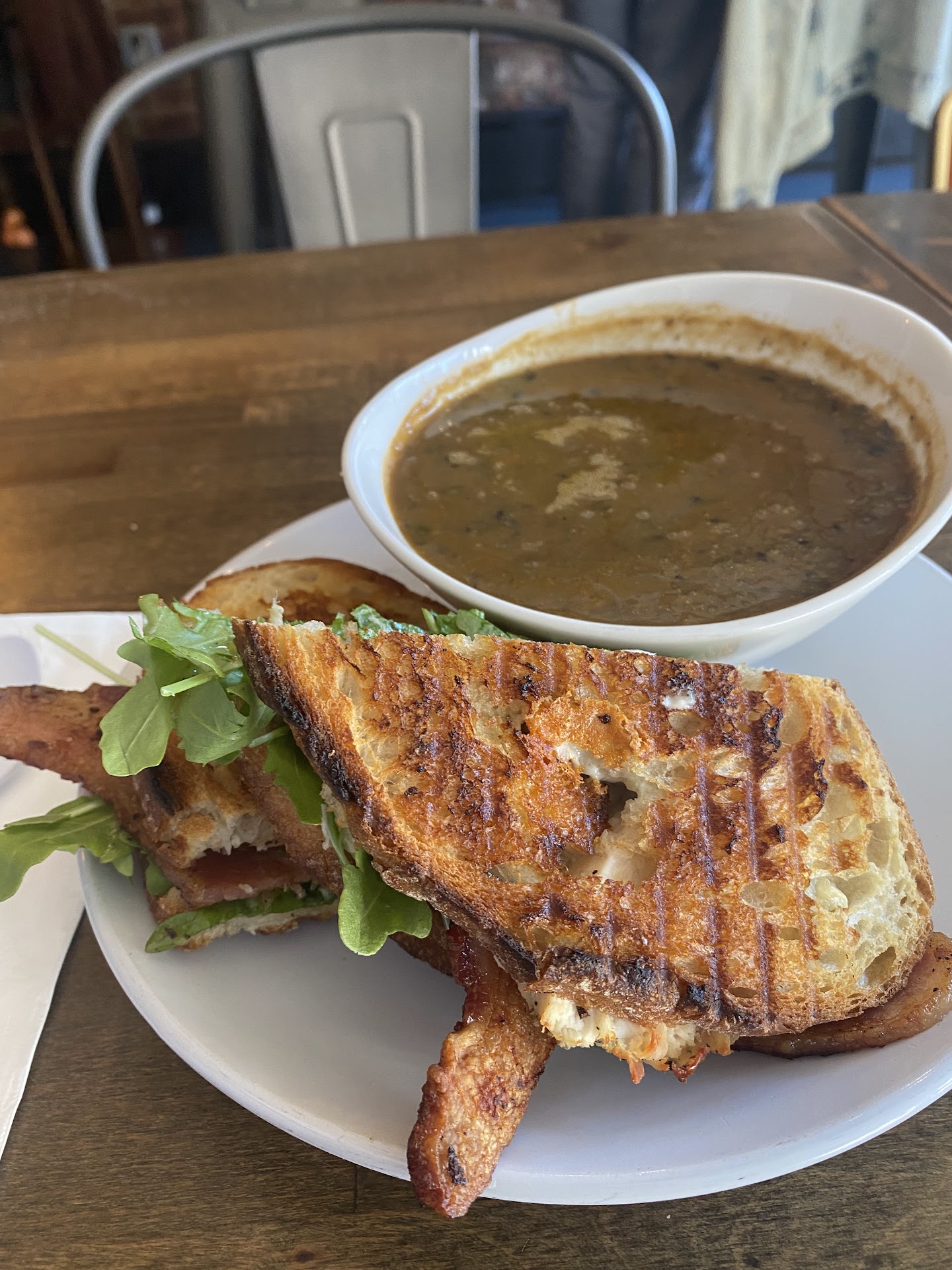 Food/drink *Frank’s Blue (Chicken Breast, Thick Cut Bacon, Blue Cheese, Garlic Aioli, and Arugula with house dressing on pressed Sourdough bread) - really good; chicken was tender, blue cheese was creamy, bacon crispy, bread crunchy *Hatch Green Chile Black Bean (onion, carrot, cilantro & lime) - really good; heat from the chiles; lime came through; big portion...