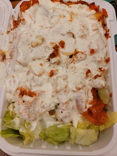 I had the lamb over rice. The lamb was cut into big chunks and tasted like it was steamed with no flavor. Had they cut it smaller and suauted it longer it might have had more flavor. The white sauce was too tart and no parsley, dill, or other ingredients incorporated in it. The hot sauce was hot, with really no flavor. The rice was an off white color and bland. The salad is just mainly lettuce, no tomatoes and no big slices of onion.