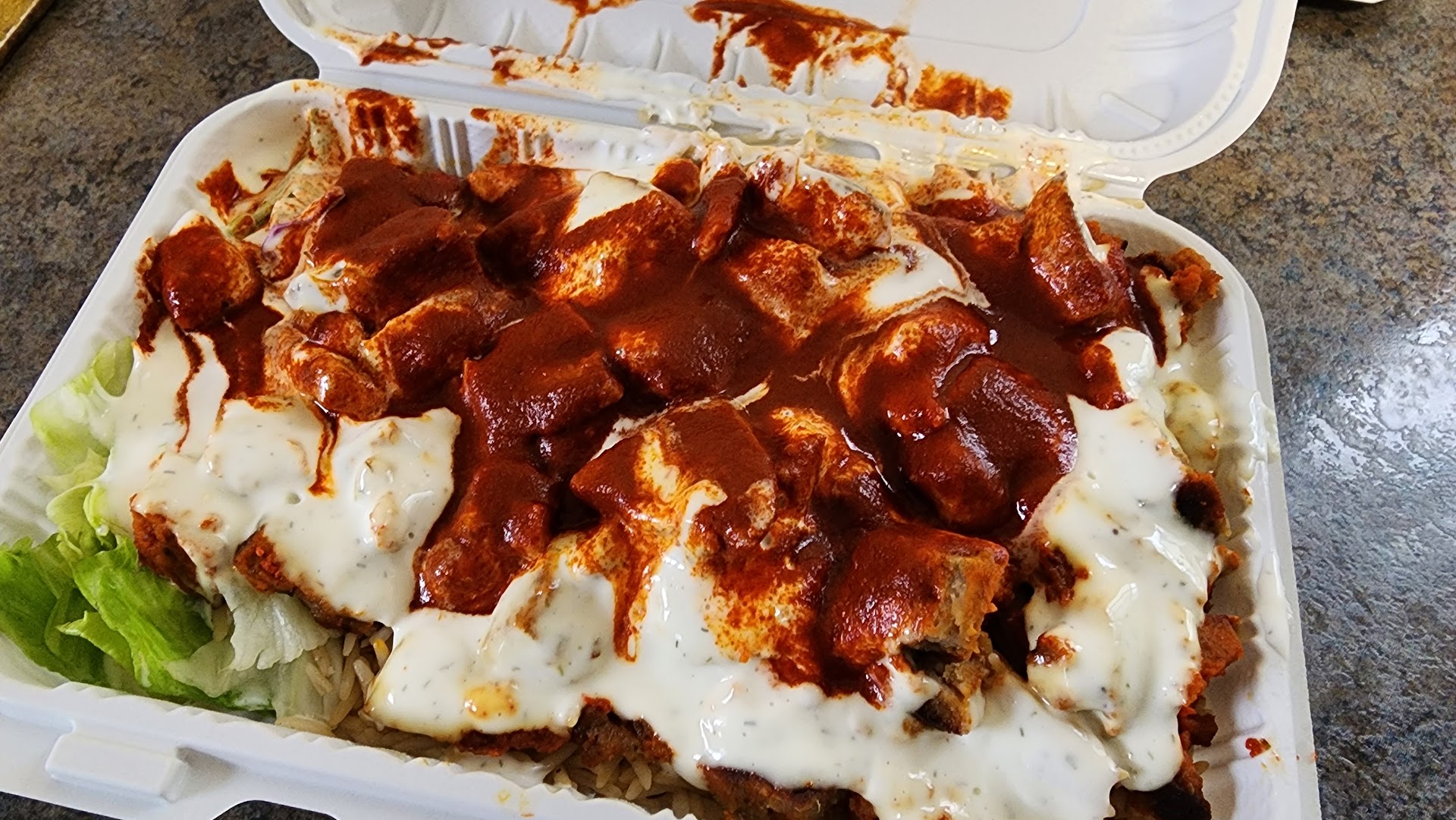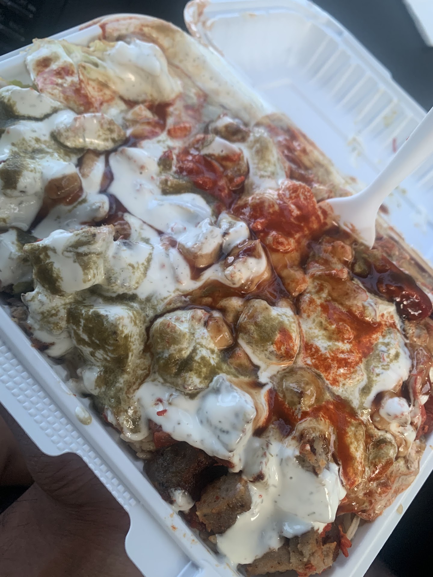 I looked at the cart personal. Not Asian based. I asked for the food to be made more spicy, lady shrugged her shoulder and said she will put more hot sauce. The food came out within two minutes of me asking for three combos of chicken and lamb over rice, a red flag popped in head.