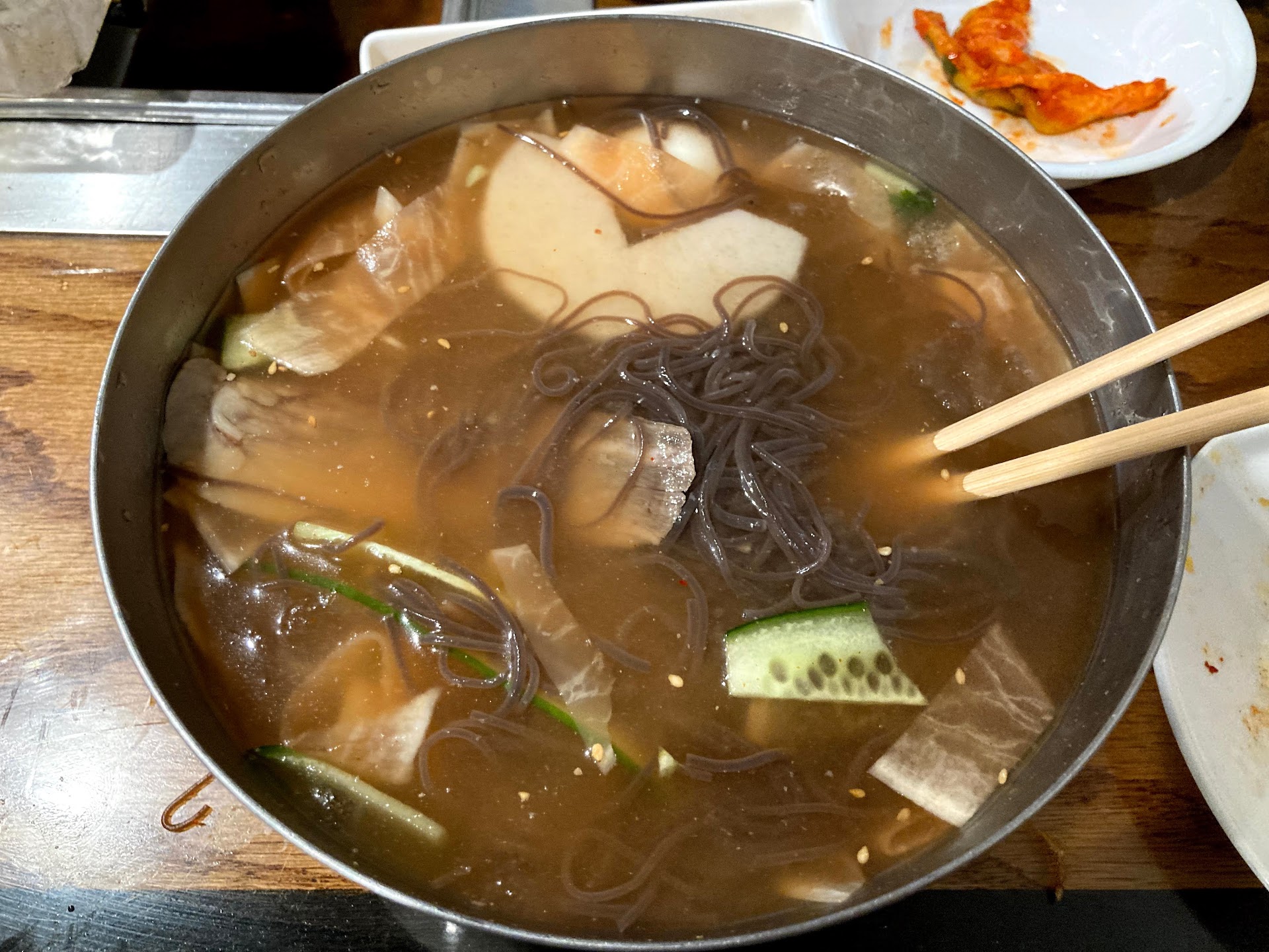 As tradition demands, the best way to close a barbecue feast is with a bowl of naengmyeon, a soup made from buckwheat noodles and served in a chilled broth of beef stock and dongchimi (radish water with kimchi). Make sure to toss in plenty of hot mustard and vinegar. A TV flickers overhead, playing the morning news in Seoul. If it weren't dark outside, you'd think...