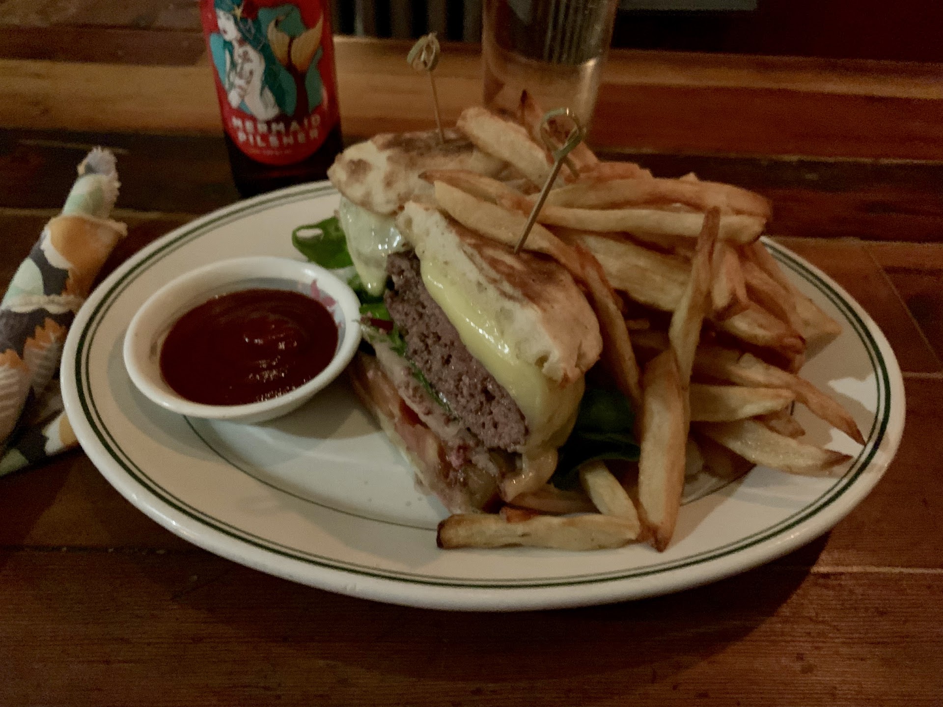 Last we split the burger with organic swiss cheese and bacon, hands down top 3 burgers ive ever had, medium rare was hot enough to melt the cheese and red in the middle.... thick, awesome bacon, cheese was perfect, ugh... could eat this for breakfast everyday