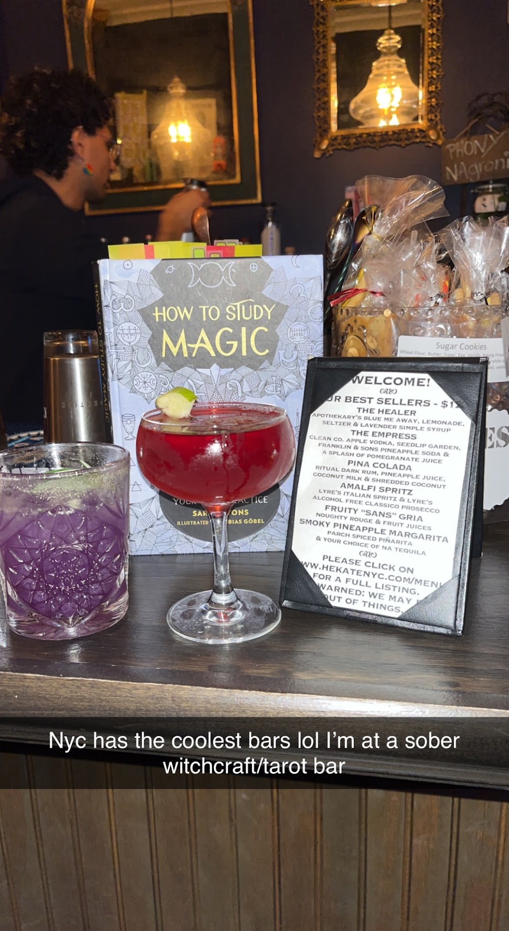 This is the prettiest, most unique cafe/bar in NYC- it’s an alcohol-free bar, it’s got witchy artworks and products for sale, AND it’s got amazing furniture and a galaxy painted on the wall. What’s more, they have tarot readings available most days from 3-7pm. And events most weekends. It’s really a gem. Most people think this place is connected with the withcraft shop Enchantments next door, some even assume it’s “their coffee shop,” but the two aren’t connected in any way, totally different businesses, and totally a coincidence that the two moved in next door to each other post-pandemic. Maybe something magic in the air on this block :) There’s so much going on at this coffee shop it takes a while to explain it all. Bar owner Abby, who owns and works at the illustrious Lucky Bar across the street (regular alcohol bar and meetup spot for Burning Man crowd for years) opened up this coffee shop and runs it along with Brooklyn Coffee Roasters. The idea is an artistic, coffee-and-nonalcoholic drink spot, with a super witchy twist. It’s got a super feminism meets Victorian style with a touch of galactic mystique vibe. Also the nonalcoholic elixers are served in amazing crystal glasses. You have got to, you have GOT to, visit this place if you’re anywhere NEAR this part of town. So this place is opened pretty recently and is still evolving and new things are added all the time. The menu is growing as Abby’s bar staff learn espresso drinks and Brooklyn roasters learn to mix drinks (alcohol free ones). Which reminds me, I haven’t even talked about the drinks. Abby and her staff from Lucky bring years of expertise mixing amazing-tasting beverages, and now they have a place to experiment with a whole range of new products and innovative alcohol-free brands. You can really taste the artistry in Abby’s mixed drinks, and with their being alcohol-free, it’s not even about disguising the taste of liquor, it’s about what unexpected flavor amazingness am I going to get next. So as I’m writing, the alcohol-free elixirs tend to be available after 4pm for the evening crowd, and the rest of the day coffee drinks are available. The 2 kinds of drinks will be available for more hours of the day as the staff grows and gets the training. I’ll update in future. Oh, and I didn’t mention tarot readings! A different reader is available almost every day of the week, each one has their own approach and prices. You can sometimes catch one hanging out at noon, or later in the night, but they tend to be there 3-7. It’s a very diverse and eclectic bunch they’ve got reading there. They are part of what makes this cafe spontaneous, artsy, organic, unexpected. And of course magic. As I said, lots to be said about this spot. It’s sure to become your favorite hangout if you’re a local, or a favorite memory if you’re visiting NYC. Also If you’re there while Abby is mixing drinks, just ask her for whatever she thinks you’d like or whatever she’s developing now, you’re bound to get a drink that’ll knock your socks off, you’re in the...
