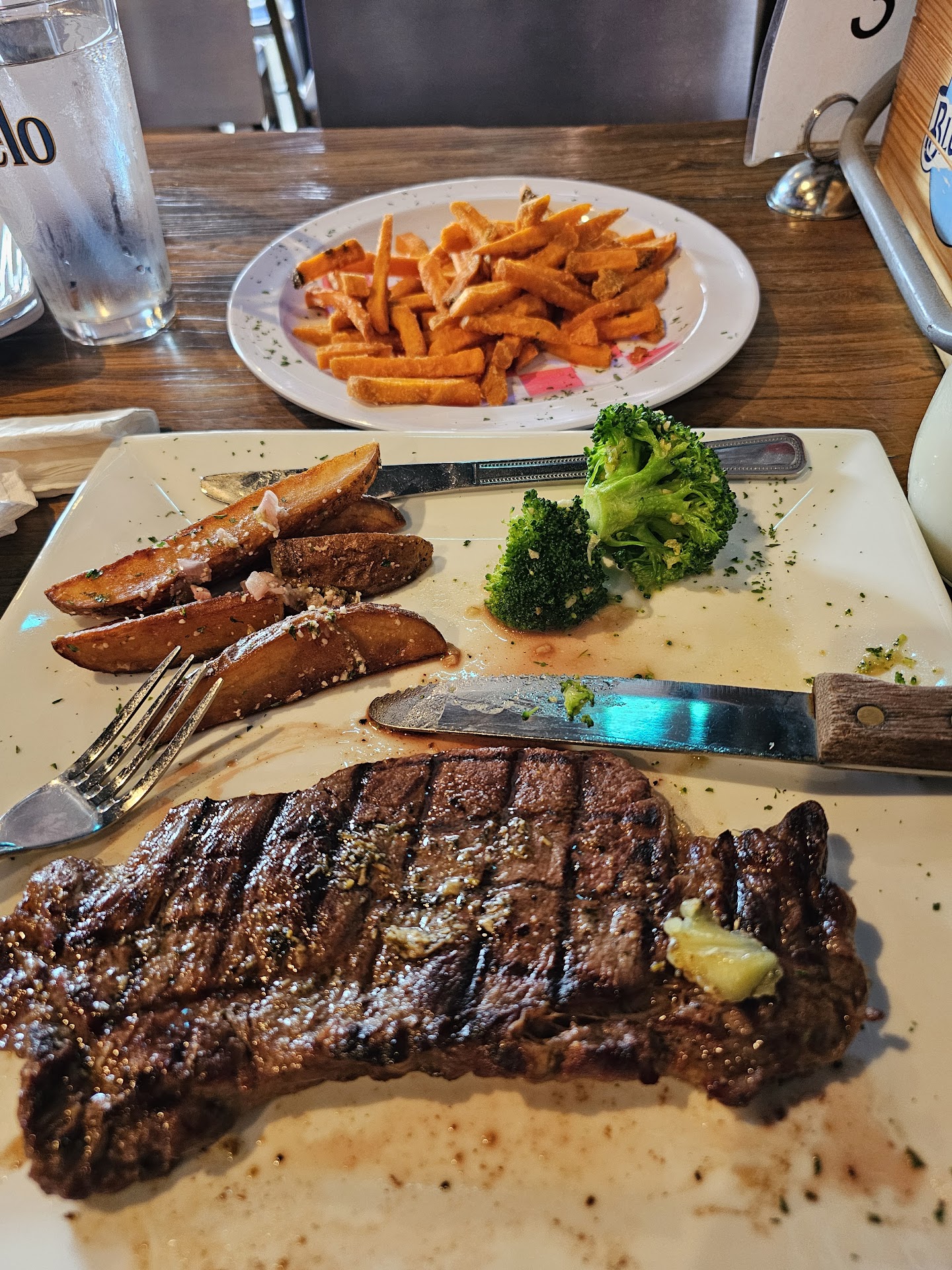 Read moreMy husband and I came to this place for the first time last Wednesday. They had a delicious $16 wed steak special and we loved it! We came back again today for the same special. Only this time we had a different server and while she was very kind, she didn't seem to know the menu well, and she didn't seem to have very much training. We ordered the same Wednesday steak special. She said it did not come with sides when it did last week. Broccoli and potato wedges. To be clear I said, the steak is a la carte now and she said yes. So we each ordered a side of truffle fries and sweet potato fries.We waited for 2 draft beers for almost 15 minutes when there were only 2 other couples in the place. We got the beers and they were flat so we had cocktails (delicious btw). Then the food runner brought 2 salmon dinners out to us. We had to send them back for the steaks that DID in fact come with 2 sides (Broccoli and potatoes wedges). So we had 2 giant plates of fries that we did not need to order. I went to the restroom, and while I was in there she spoke to my husband and apologized for the service. Thanks for owning it! The kitchen team is FANTASTIC and the food is consistently delicious! These guys know how to temp a PERFECTLY medium steak. FIVE stars for the kitchen staff! Two stars for service. Three stars for atmosphere, only because the music selection was literally Ja Rule and Ashanti over and over again. Ugh! A modern Playlist would have been great, like last week.