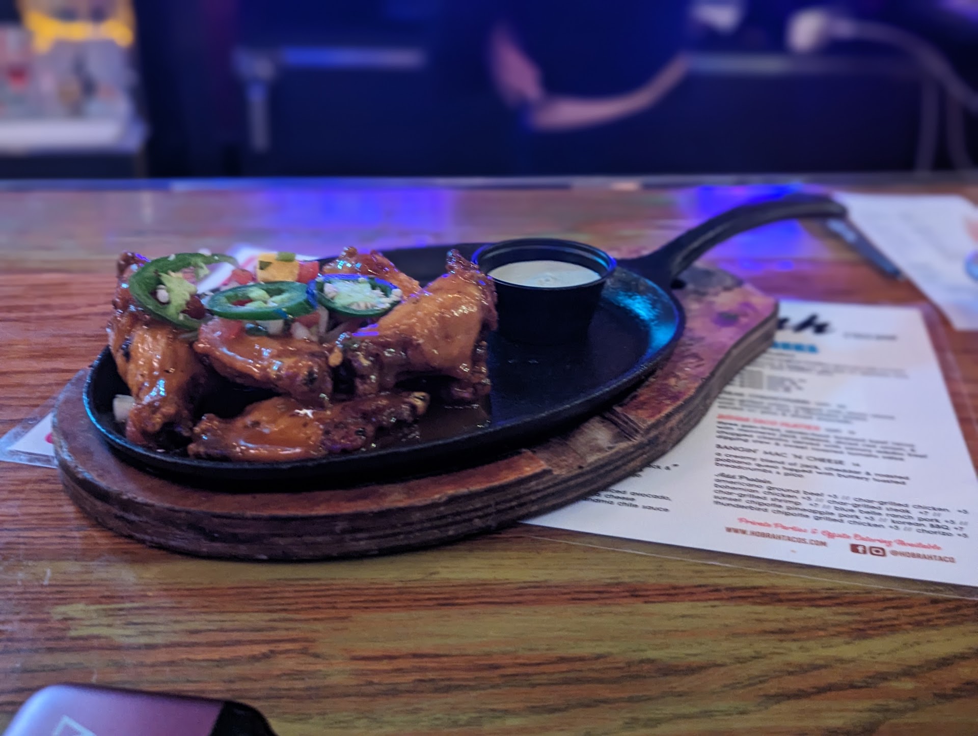 Anyway onto the food. The food was alright. Had 3 different tacos all of which almost tasted the same, except for one smothered in bbq sauce. They all tasted pretty bland and was like they were trying too hard to think outside the box but failed. Cheap stringy coleslaw on most of their tacos for much needed texture. Steak tacos were cubes of leather belt oozing with typical BBQ sauce. Obviously this isn't for people who've had authentic tacos or know anything about spices. All of the tacos I ordered came garnished with cilentro ontop, which wasn't even removed from its stem. Never seen that before at a restaurant. I ordered 2 beers with my wife when when placing our order, only to remind my waiter minutes before finishing our dishes that we still didn't get our drinks. A whole meal went by before we had anything to drink.. Guy didn't even check on us once...