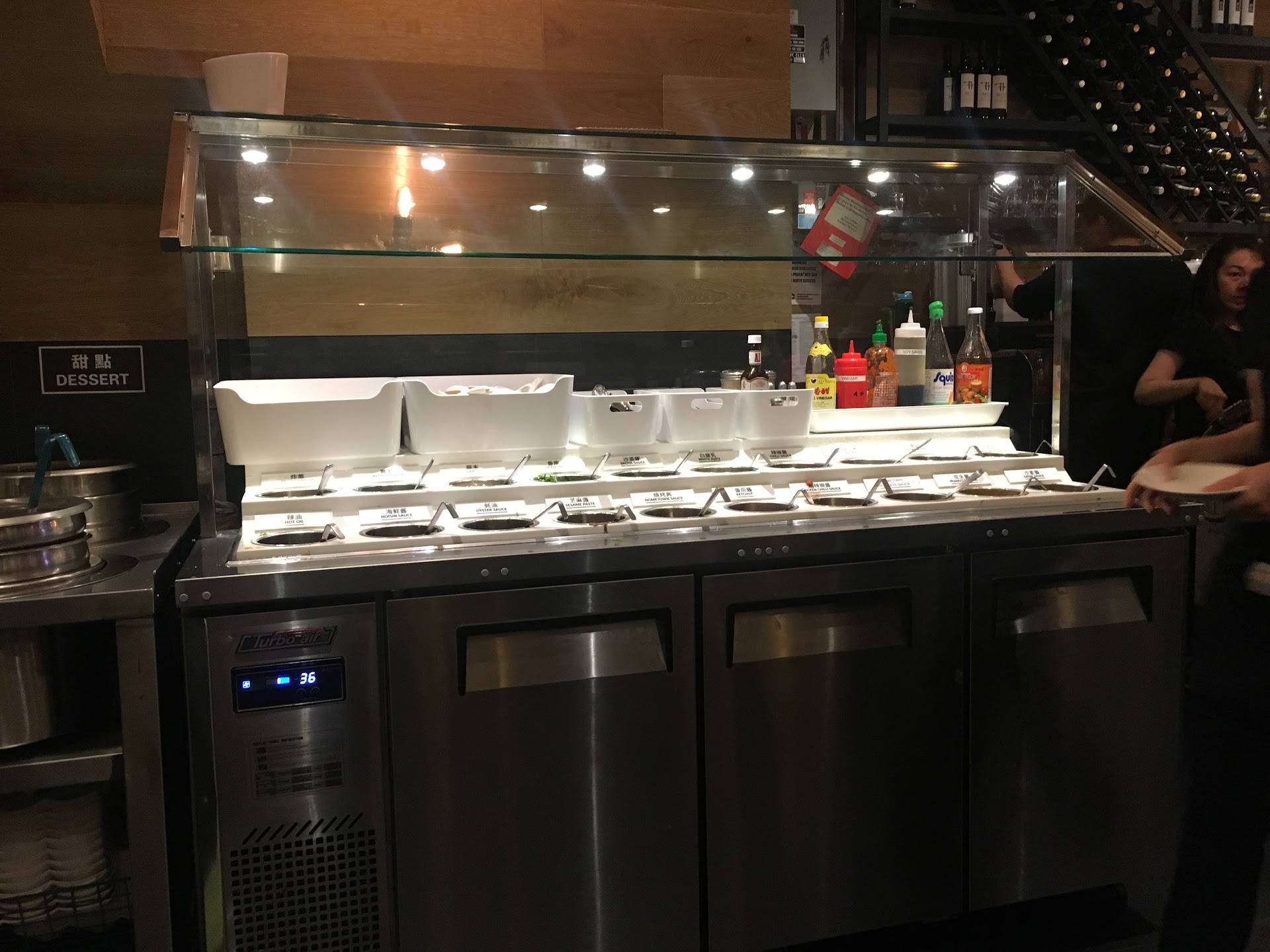 The layout consists of some 4 tops and some 6 tops, and I believe if you need a table for more than that, you'll need to make a reservation. This restaurant has two levels; The ground level when you walk in, and a lower level. Each level has tables, and they also each have their own sauce and dessert station. The ground level also has a bar, but it is not for patrons to sit at.