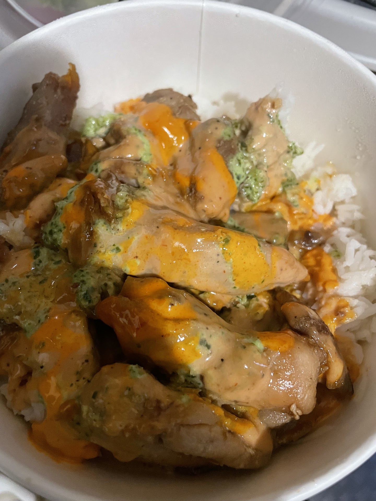 The food I ordered was absolutely subpar, clumps of old soggy rice, recooked dry tough to chew clumps of chicken, barely any Hulk sauce in the bowl, and no fries in the Dubbap bowl (which it always came with at the Hoffman St location). The extra Hulk Sauce I ordered exploded with air upon opening and had a watery consistency and strange taste which is not normal for this sauce (it’s the best most popular sauce they offer). Lastly, the Pork Mandoo was burnt and too crispy to eat. I don’t like throwing away food but I couldn’t even eat 1/3 bowls nor eat the Mandoo. Very disappointing considering how delicious the food from the Hoffman St location was.