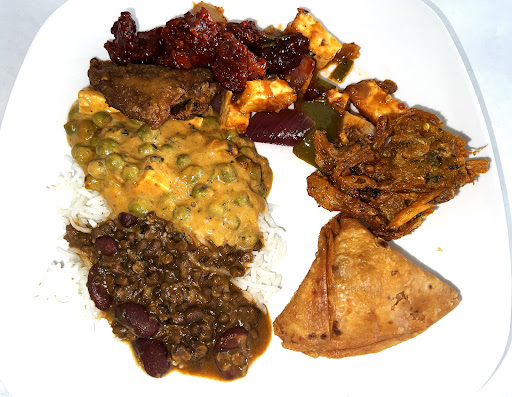 Photo contains samosas, goat curry, sweet and sour chicken, okra with onions, and tandoori chicken (there’s rice lol,...