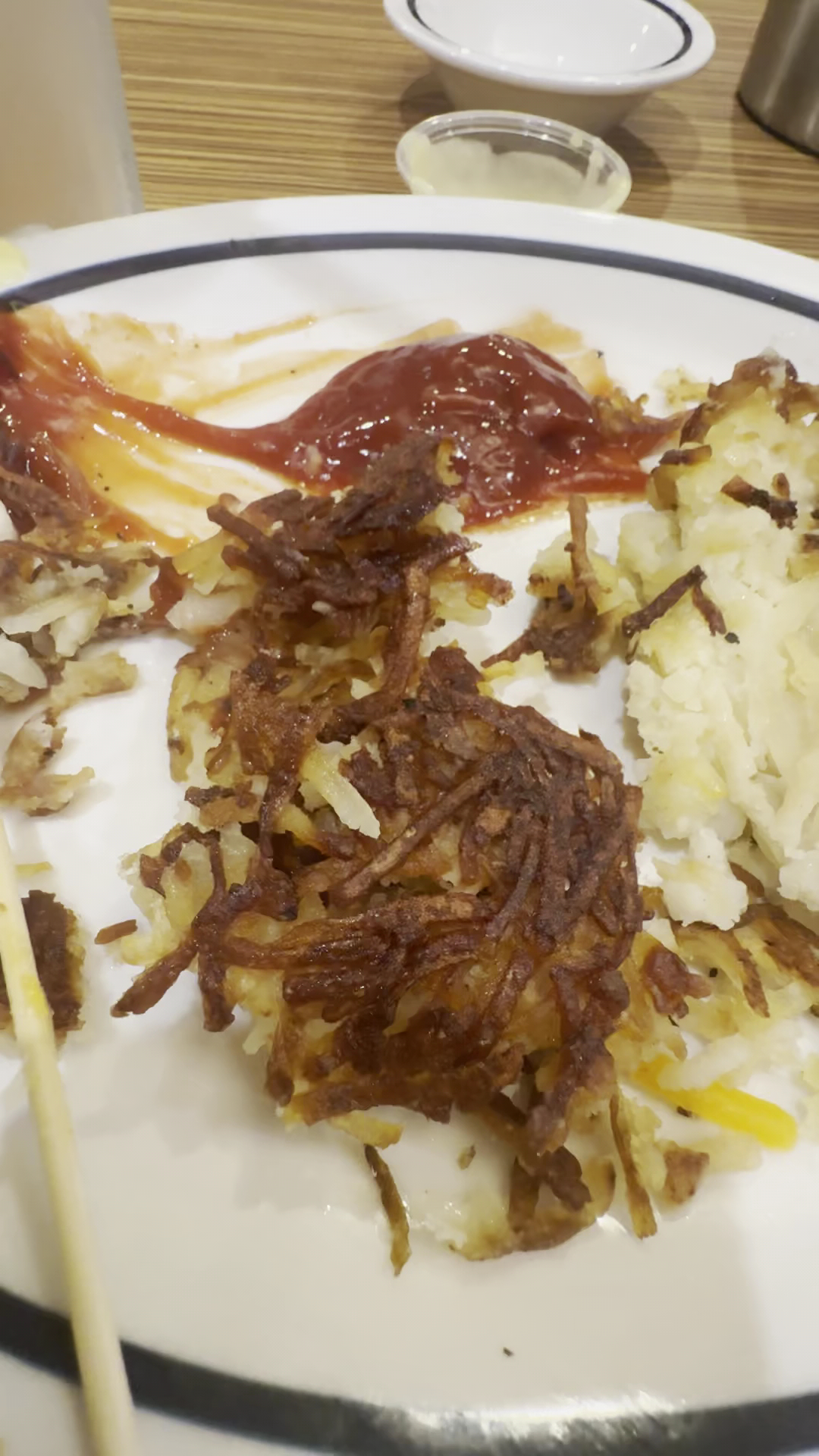 After 50+ minutes, a woman who looked like she was possibly the manager comes with some of our food. She was so rude that I honestly just wanted to get up and leave. She handed us our food like we annoyed her. She didn't care who ordered what and just handed us random orders. No smile, no apology, nothing. Our server did arrive with the rest of the food. It was not worth all the wait. The food was, ehh. We ordered pancakes, eggs, hash browns, ham, bacon, and fruit. The fruit bowl was 90% bananas and like 2 grapes, 2 pieces of melon, and it was disgusting. The pancakes were cold, as well as the rest of the food.