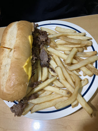 Once we were seated, things improved. Our hostess was polite, and our waitress was very friendly and attentive throughout the meal. I ordered the rib tips and eggs with hash browns and a stack of pancakes. Others in our group had a burger with onion rings, a Philly cheesesteak, and various breakfast combos including strawberry pancakes and French toast.