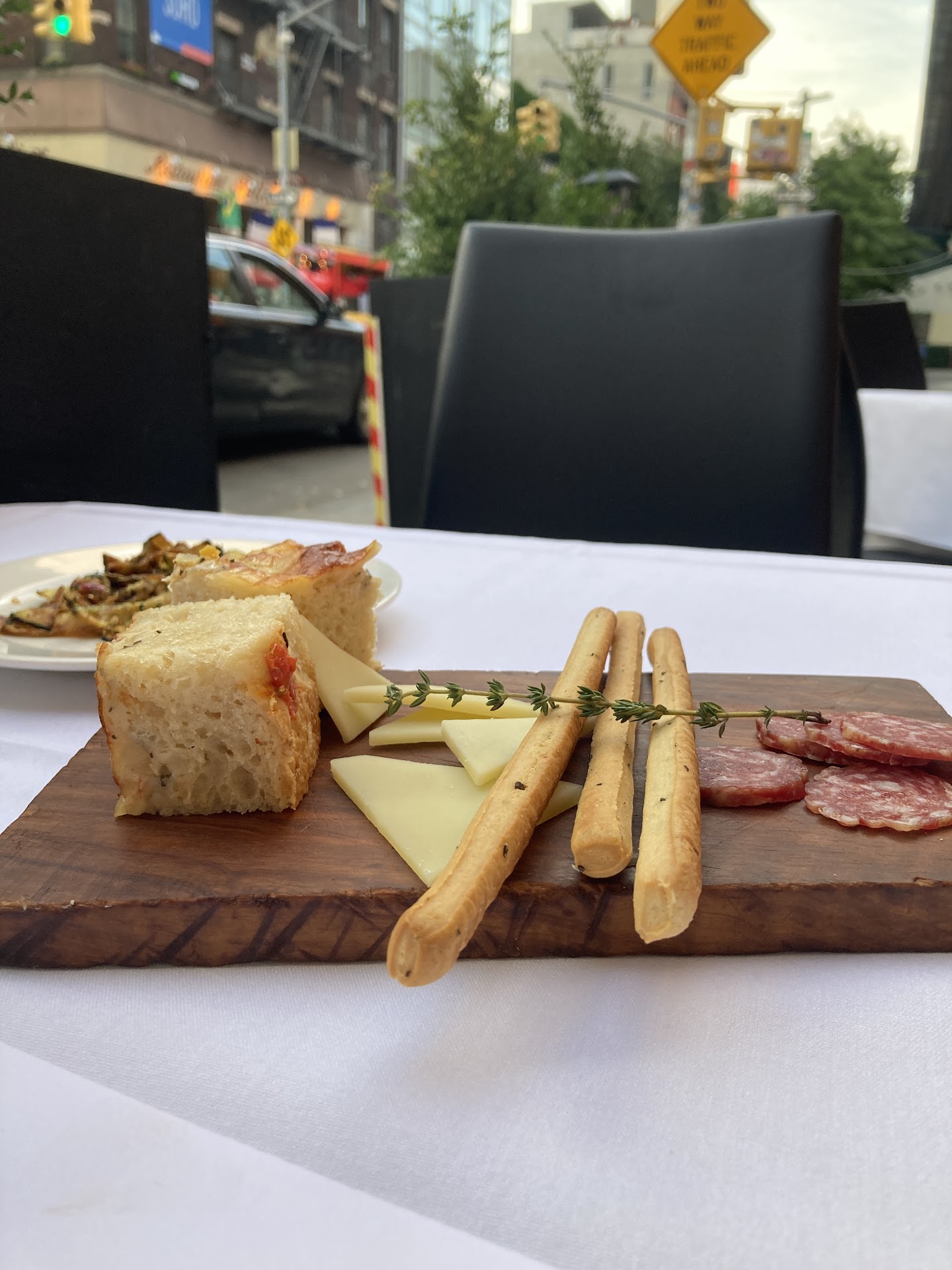 Came for lunch with coworkers to celebrate an important milestone. I have passed by this place numerous times but never came in to eat. It's beautiful in its relative sparseness. White walls with Hemingway quotes. Wrought iron chandeliers. Bella. Their menu looked extensive, but everyone ended up ordering from the lunch prix fixe menu - probably to try a little bit of three courses. The caprese for app and hanger steak entree was a popular combo. They had a lemon tiramisu dessert on the menu but they informed us that they had no lemon, just plain tiramisu. Strange. I got the Italian cheesecake. The pre-meal bread was a mix of long bread sticks and crispy flatbread with cheese baked on. Not freshly baked and probably either bought or premade a while ago. We all had a glass of wine to celebrate. The appetizers came out. One person got the tomato, onion, and bacon. The two hefty pieces of bacon was a pleasant surprise and made me regret my choice. But, once I got my caprese, I was pleased with three choice. The mozzarella was softer than I was used to but it was just firm enough to have substance.