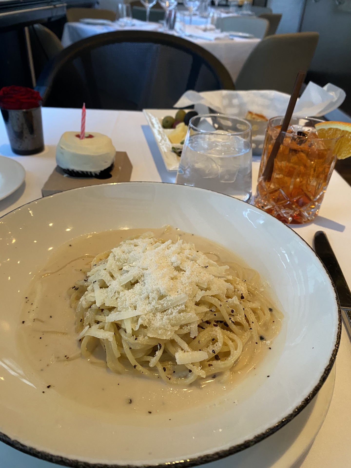 Read moreWhat a treat! Im not really an “out to dinner person” but i care to start treating myself more and since food is great love of mine; i thought I’d make it a habit to try different food spot. It was my first time trying this place but I passed it while walking the neighbors and thought it’d be nice to try out. They did NOT disappoint. I made a reservation for 4:30 pm because it was a fair enough dinner time for me and i saw they had a pre fixed dinner with options that i liked as well as a happy hour. I showed up with a cupcake since I was celebrating my birthday and they quickly seated me and acknowledged the occasion when seeing the cupcake. I ordered the Spaghetti Cacio e Pepe as the apetizer which was creamy, perfectly seasoned for my taste but i would skip it if you arent into a pepper taste. I sipped the best old fashioned i ever had while I waited for the next course, which is saying a lot from me since it is my favorite drink. For the next course I ordered the NY Strip since Prime was the main reason i decided to try out this place. I asked the waiter if how does he recommend the steak and he answered medium but i decided on medium rare since it is what im used to. It was fantastic but i think next time I’ll be curious to try medium. I had to get another old fashioned with my steak since it was soo good and it was just as good as the first. Extra points for consistency. I finished off with a strawberry shortcake and i truly had no expectations for this part of the meal since I’ve already show up with my favorite cupcake which they kindly lit for me and wished me a Happy Birthday but this Strawberry Shortcake was truly phenomenal. It was thick and fluffy but also juicy like a Tres Leches cake. I will definitely be back for another night. Thank you for...