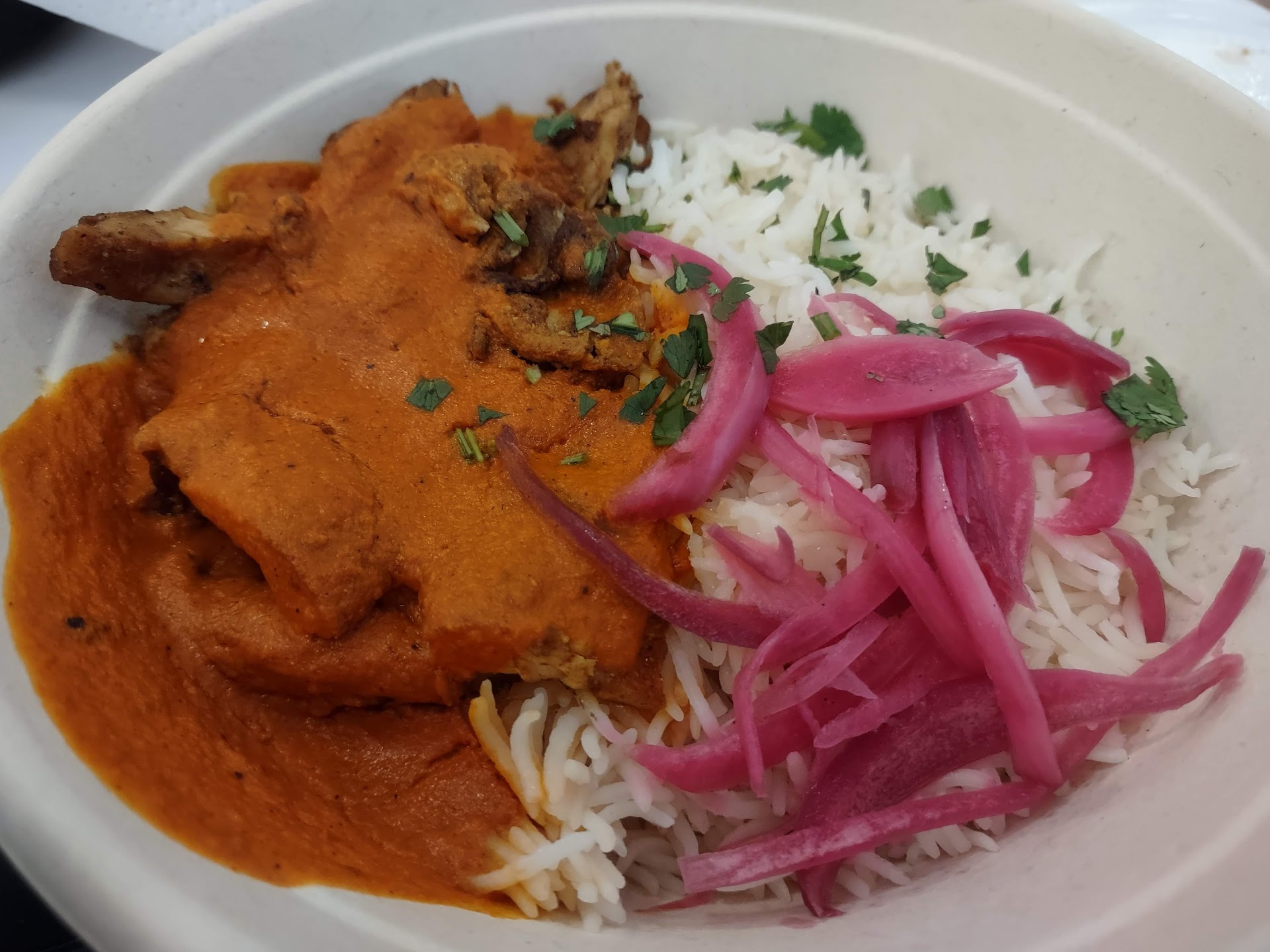 My food was there and waiting for me. I am not sure how long it was sitting but the sauce already thickened but the plate was hot. Personally I wished they coated the chicken with the sauce instead of just dropping it on top of the chicken. I felt that there wasn't much sauce and not enough to coat the rice. The chicken was a bit dry and so was the rice. They only included a bit of pickled onions. The sauce had flavorful but it was mild in terms of spice and heat. I feel like this is geared towards people who might be more spice averse. It's not bad for a fast casual Indian restaurant but it's not for those craving more spicy and flavorful Indian...