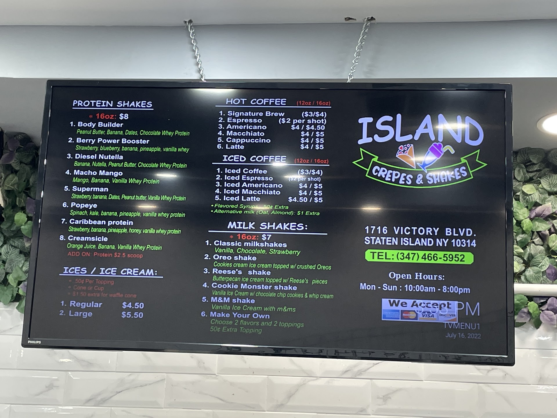 Ā Ā Ā Read moreThey are experts in juice, crepes & shakes! They care about their customers experience. The staff are very nice & the place is always spotless clean. The place is designed so well, I like the atmosphere Anytime I crave a fresh healthy juice & Iām in NY thatās where I go!! The most memorable time at Islands was last year I was there I had a sore throat the store attendant made me a special fresh made juice & the juice really helped...