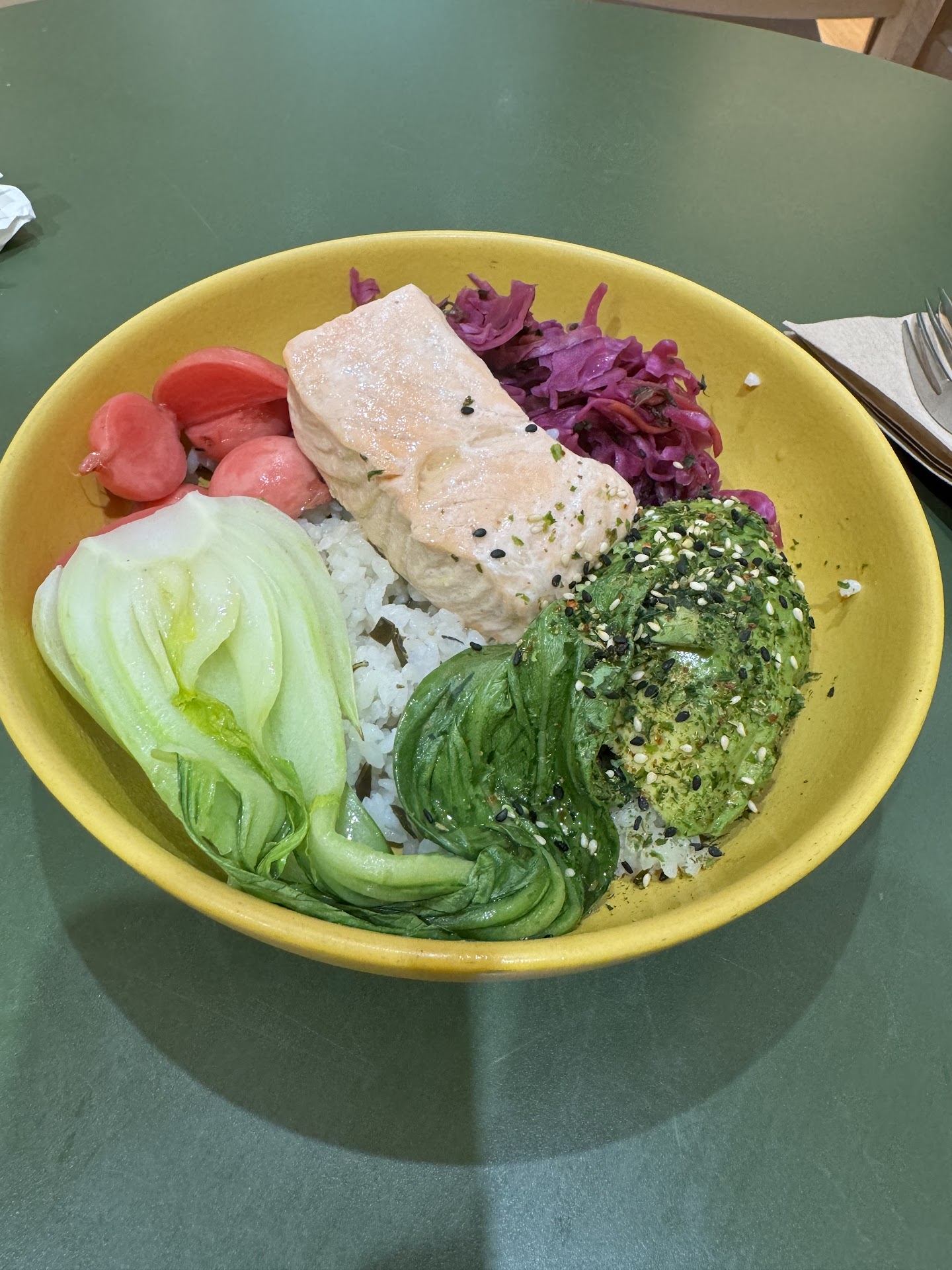 The salmon bowl was amazing. Freshest bowl Iāve had in a long long time. All ingredients tasted great and came together well. Balanced and healthy. Lots of textures and colors. Things you donāt see anywhere else. I kicked it up a notch with their hot sauce which was amazing.