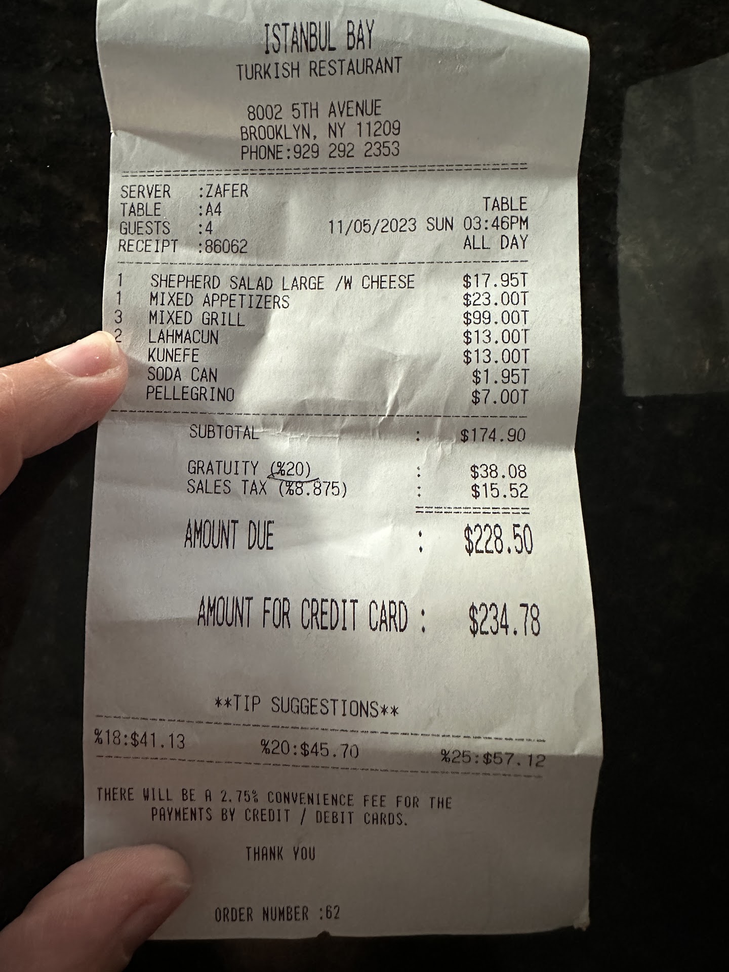 Read moreThe service today (7/28/21 3-4 pm) was horrible! We used to go there twice a week for about an year until we switched to a closer Turkish place next to our home. Today we decided to go back since we only had the best memories from this restaurant. Unfortunately, we got so disappointed. The wait staff did not check on what we need besides taking an order and brining the plates. I had to go ask for extra napkins, and order the drinks. I went to the cashier to look for the waiter. At the end, we'd been waiting for a while for the staff to come so we can get the check. Again, I had to go and ask to pay at the cashier. Zero checking in! The best part of the story is getting a bill with 20% tip added as 'service fee' as if they did deliver ANY service at all, forget about it being worth 20%!!! I was super annoying and explain to the cashier how ridiculous they are but she just mumbled how she is sorry without offering to drop the tip they simply assumed they deserve. We did not want to leave any such tip! ZERO, indeed! No idea what happened with the Management of this place, they used to be TOP! We are never coming back, and I'd go ever further to say that this place is all but Turkish, since Turkish people are famous for their hospitality and glorious service both in Turkey and around the world, so wonder who bough this place and is running it now but definitely is not having a true Turkish...