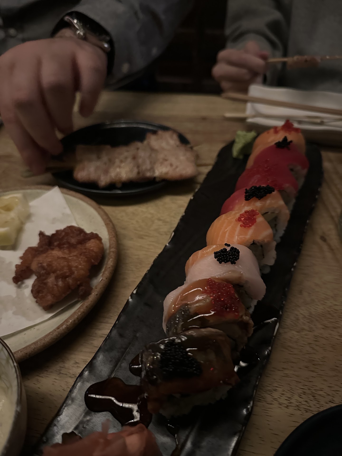 The menu is great for a big group since there aren't an overwhelming number of options. I'd say the main categories are appetizers, skewers, and sushi. We ordered a couple appetizers and sushi rolls to share, and individually ordered around 3 skewers each. I'd say each appetizer could be split comfortably between 4 people, and my side of the table ordered the Chicken Karaage ($15), Mina Roll ($21) and three skewers each. I tried the Thigh w/ Scallion ($5), âFamousâ Tsukune - Chicken Meatball ($10), and Pork Belly ($9). The sizing does match the price - the Thigh was one piece, the Chicken Meatball had 3 balls on each skewer and an amazing egg based dipping sauce, and the pork belly skewer has two pieces as well. So I thought the skewers were definitely worth it. The karaage was also amazing and we ordered another. The Mina Roll was tasty but nothing too special for the price.
