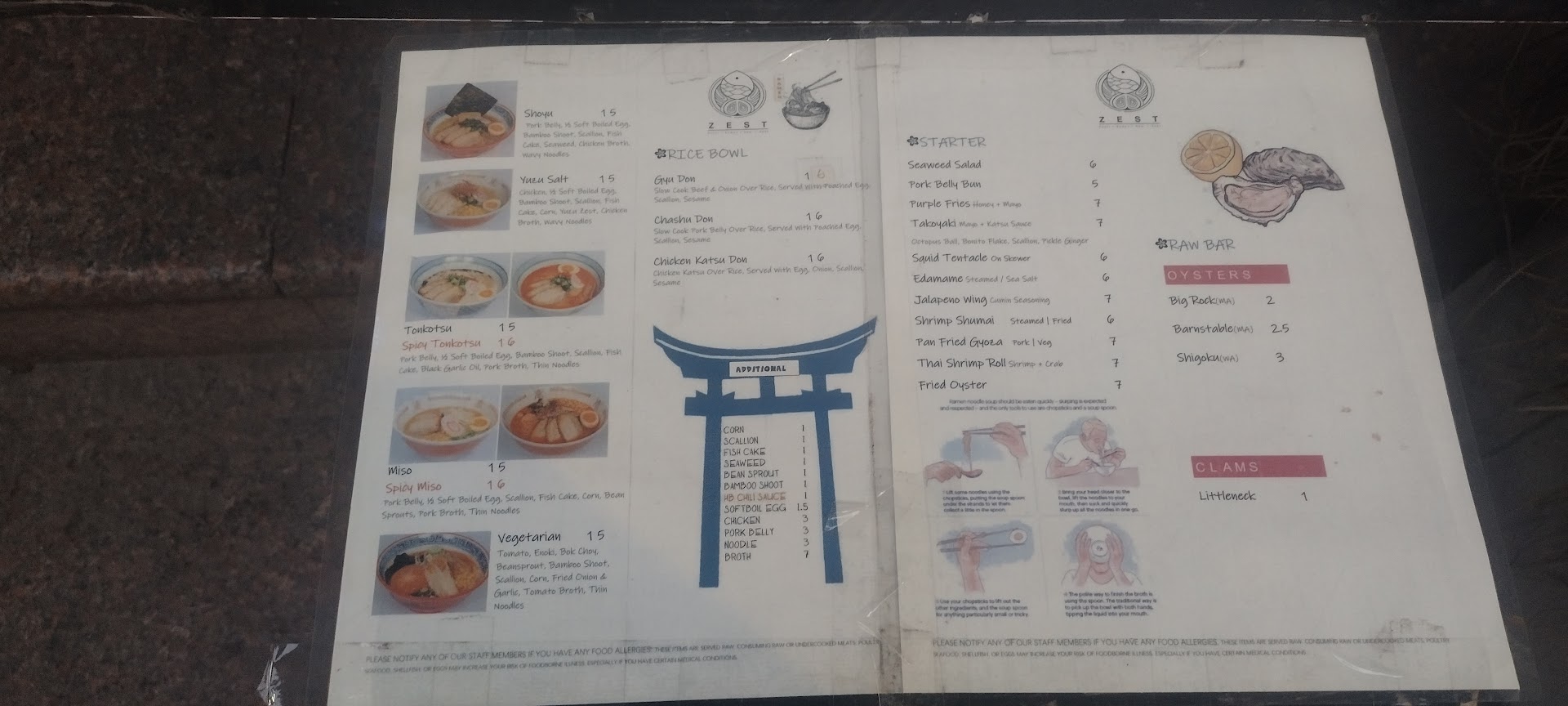 August 8th 2025 Still going to Zest, they have now added sushi rolls to their menu, they still have a happy hour, and also have added a new ramen item to their other usual soup flavors. Still many years later for me a solid Ramen choice. My only gripe, they do not have a robust AC system, at least not when i go, I will wait till fall / winter to revisit.