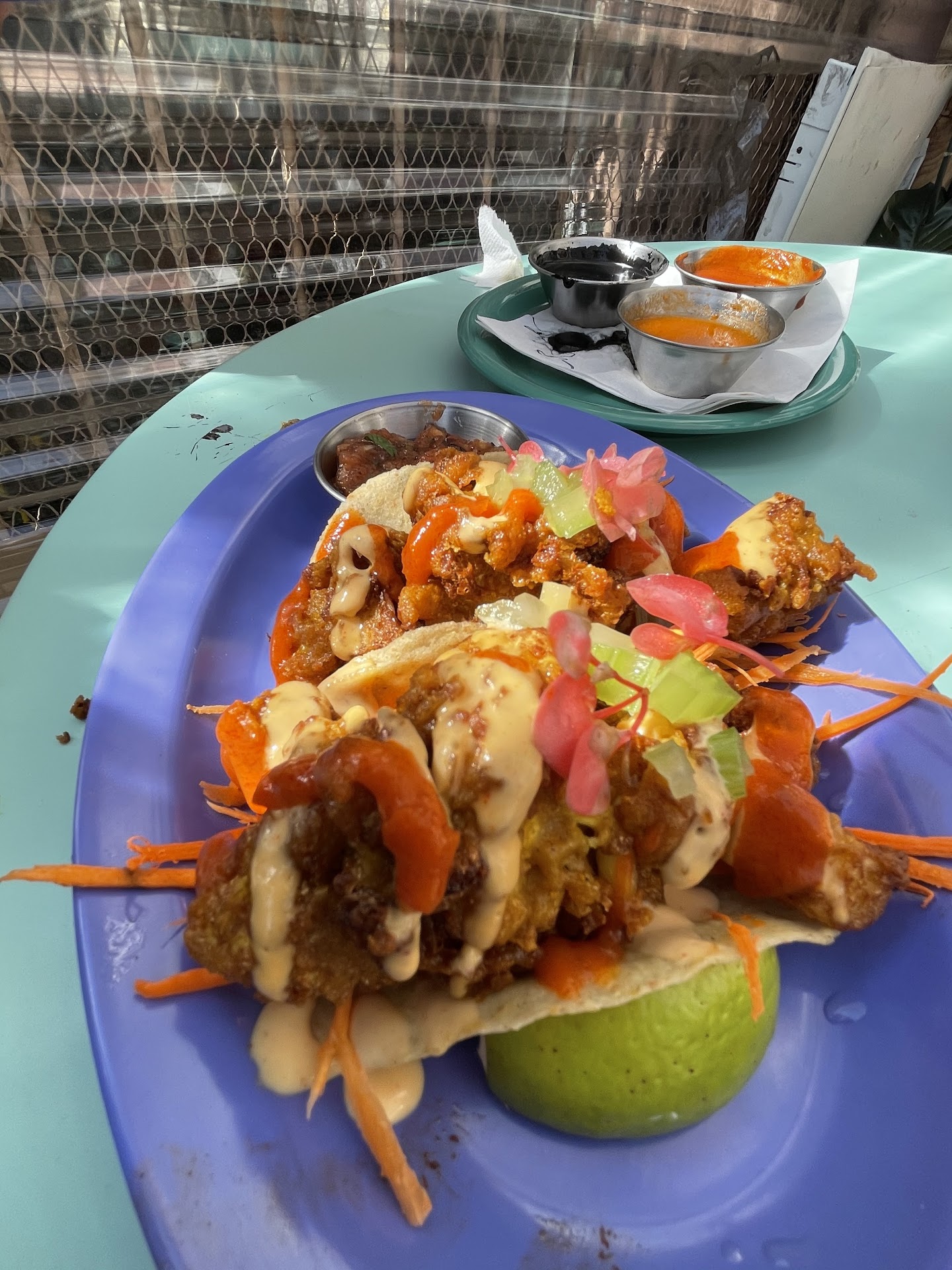 Read moreThe setup outside was super cute and I loved how they gave us our own private area outside. In my opinion not everything on their menu tasted good. I have to agree they have the best #vegannachos in the city. I have never tried nachos that are so flavorful. The #chorizo was on point and the fermented beans and the sauces and guacamole was just perfect. I have heard their chorizo #burrito is supposed to be good but we decided to order their tacos as the nachos already had chorizo. We got their Spicy Birria Tacos which did not taste good and flavors were completely off. I guess it is an acquired taste and we were not a fan. We also got their chipotle sweet potato tacos that tasted ok but nothing extraordinary. The Buffalo flower Tacos tasted brilliant and had perfect crisp and balance of flavors and sauces tasted super delicious. The #veganchurros served with coconut sauce are absolutely delicious and i think the best vegan churros I have tried.