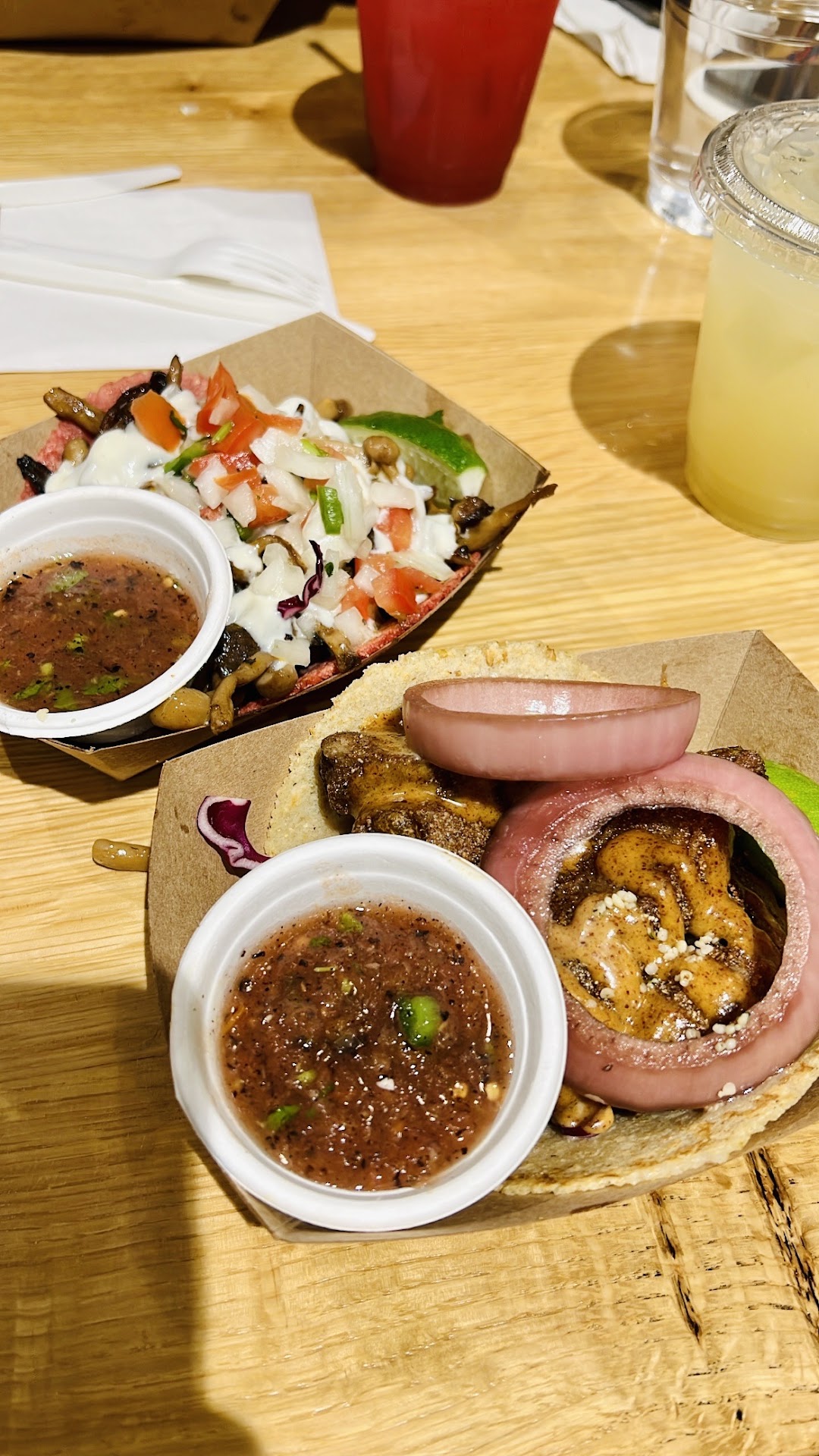 Their Crispy Pescado tacos are some of the best tacos Iāve ever had. PERIOD. The base is squash but combined with the other flavors and sauce, they are chefās kiss delicious. I would order a dozen in a heart beat. Their Mezcal Mushroom tacos on the other hand lacked in flavor. They had some sauce and salsa but the mushies themselves didnāt seem to have much flavor which was unfortunate but still tasty with their handmade tortillas. My sister had the Buffalo Pollo Burrito, which was hefty in size and flavor. Iām not a fan of buffalo anything but this burrito was tasty.
