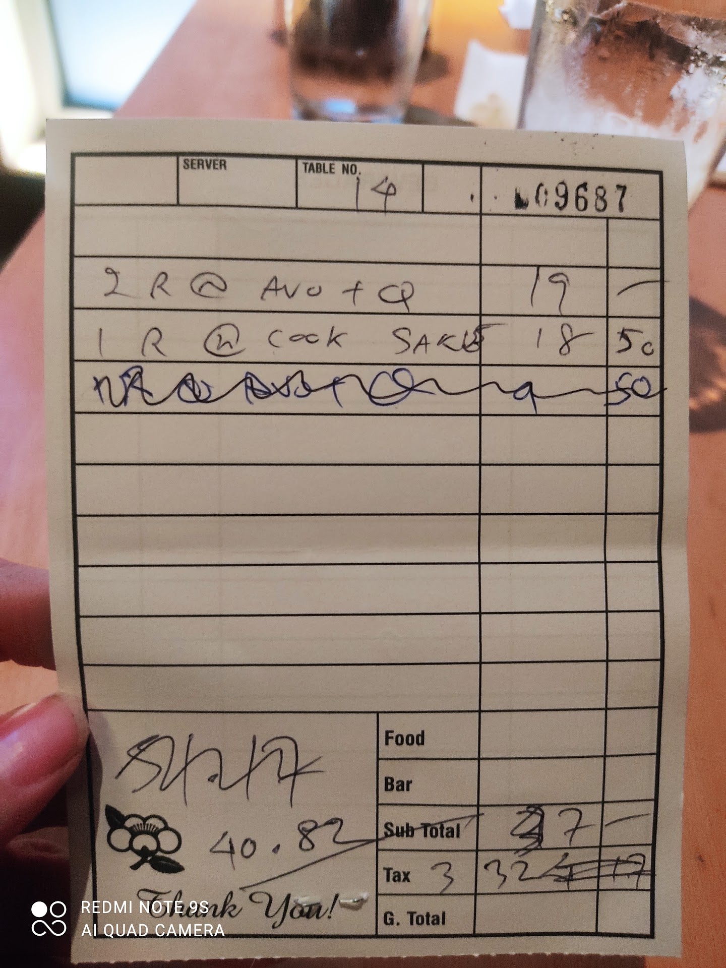 Read moreVery disappointed. I used to go here all the time at the former location and hadn't been in a number of years. I remember it being beautiful, elegant, big with good prices for the value and excellent service. NOT TODAY. I looked it up online to make sure they were still in business. Looked at the menu online that says $5 aprox for an avocado cucumber roll. The service was rude and almost non existent. I asked for salmon roll and two cucumber avocado rolls. The food was plain ok but it was missing a roll when it came. I mentioned it to the runner and was brought one more roll. When it came time to pay I noticed the bill was really high. I was charged $49 for 4 rolls. I only asked for 3. The waitress was snappy and hostile rushing to insinuate that I couldn't fool her because she took the order. I explained that they only delivered two rolls at first. Horrible experience and very unprofessional approach to clearing up misunderstandings with costumers. The food was alright but atmosphere was tense with poor service. The service was bad before the confusion about the bill. Going to tenzan tomorrow which has become my favorite spot for superb quality reasonably priced sushi with outstanding service. Unfortunately japonica can't compete anymore. Very sad but...