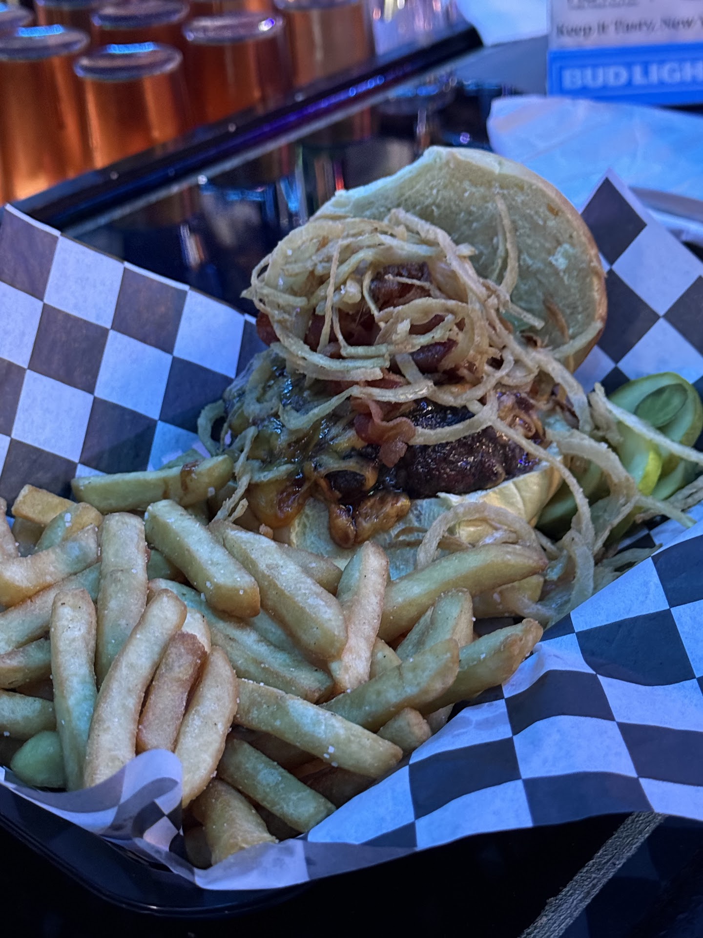 The food itself was fine, nothing special, just typical bar food. Exactly what youâd expect, nothing more, nothing less. But the biggest issue here wasnât the food, it was the service. I donât want to put all the blame on the server, she was clearly trying but it was obvious she was juggling way too much. It looked like she was acting as the bartender, server, hostess, and overall manager of the floor all at once, which is simply too much responsibility for one person. The end result is that tables like ours got neglected, and the basics (water, utensils, timely service) were overlooked.