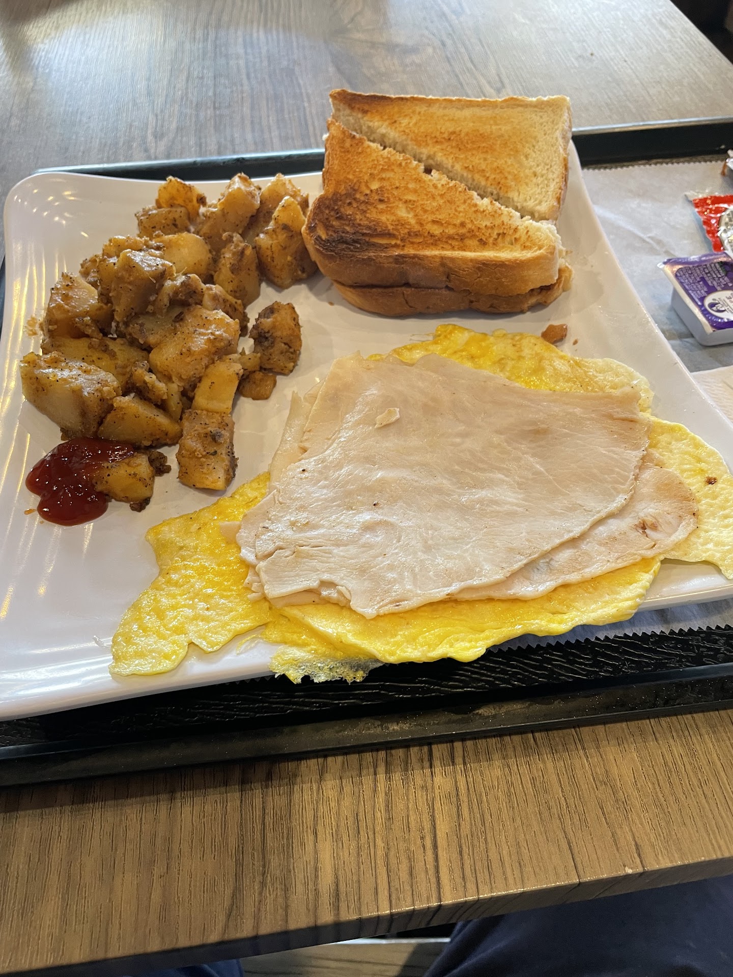 I ordered the egg and meat platter, meat in this case was turkey, and I was expecting turkey sausage but it was deli turkey. I ordered scrambled eggs and this was not scrambled, see photo.