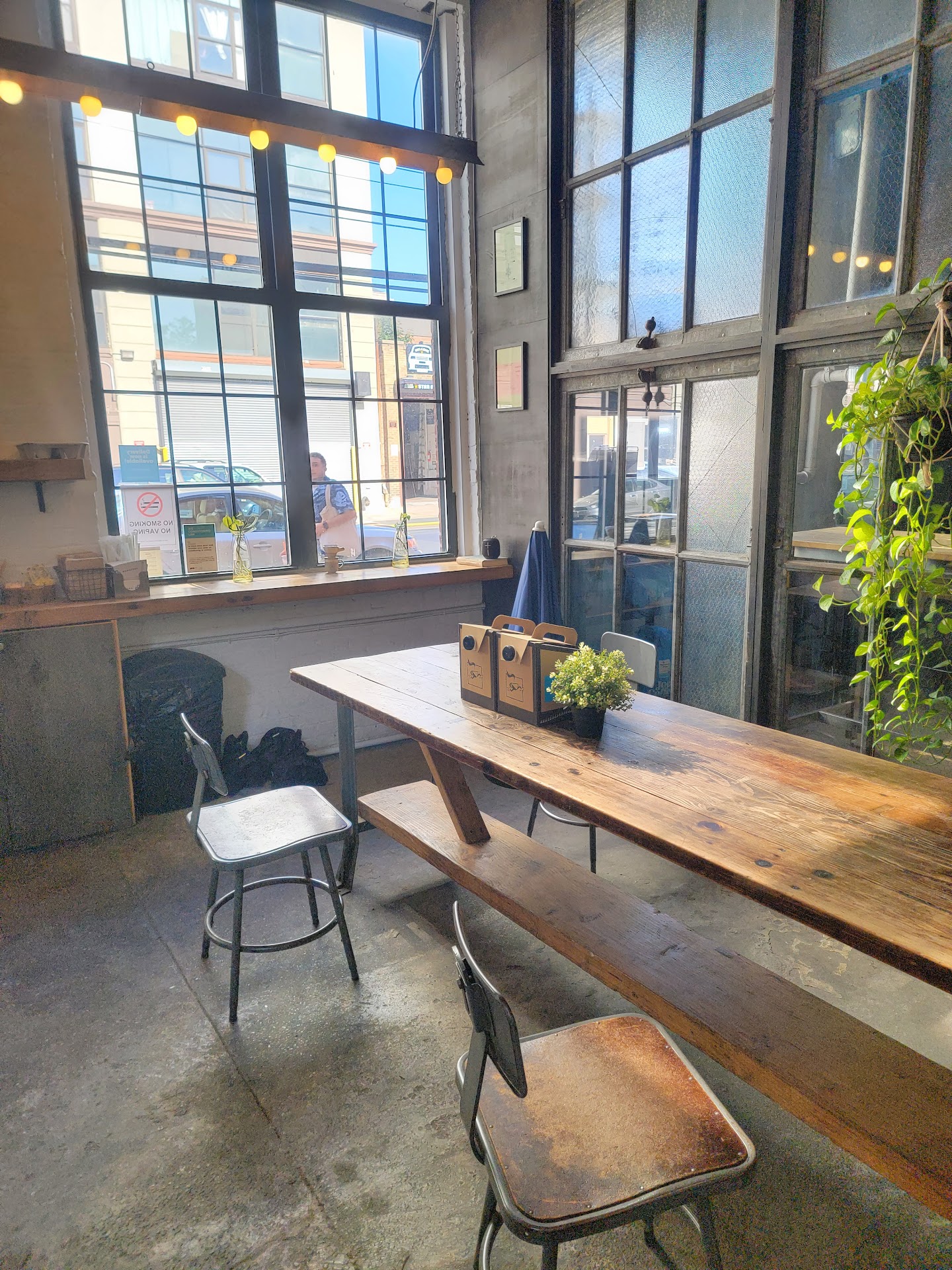 Good coffee, fresh snacks, free WiFi, and outlets. The space isn’t very big so I try to tip extra and not stay too long, but the communal table is very comfortable for working.