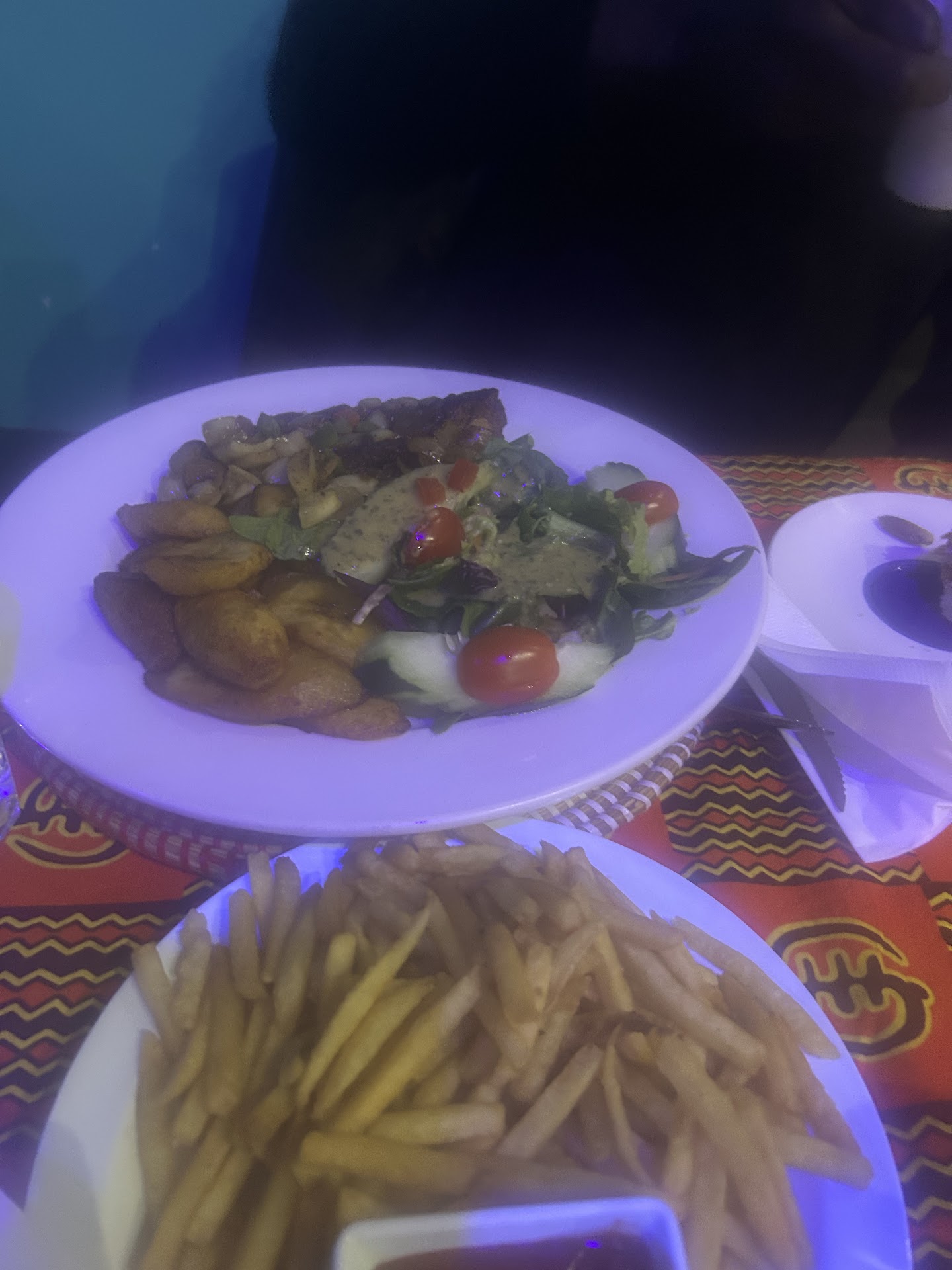 The restaurant features small tables adorned with beautiful traditional West African fabric, and livens up the place. The service was superb, the waitress was attentive and very kind.